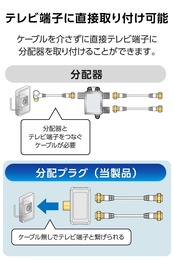 ■入力側はストレートプラグ式、壁面TV端子に直接差し込みます。出力側はF形コネクタ式、テレビやレコーダーへの接続は別売の同軸ケーブルを使用します。