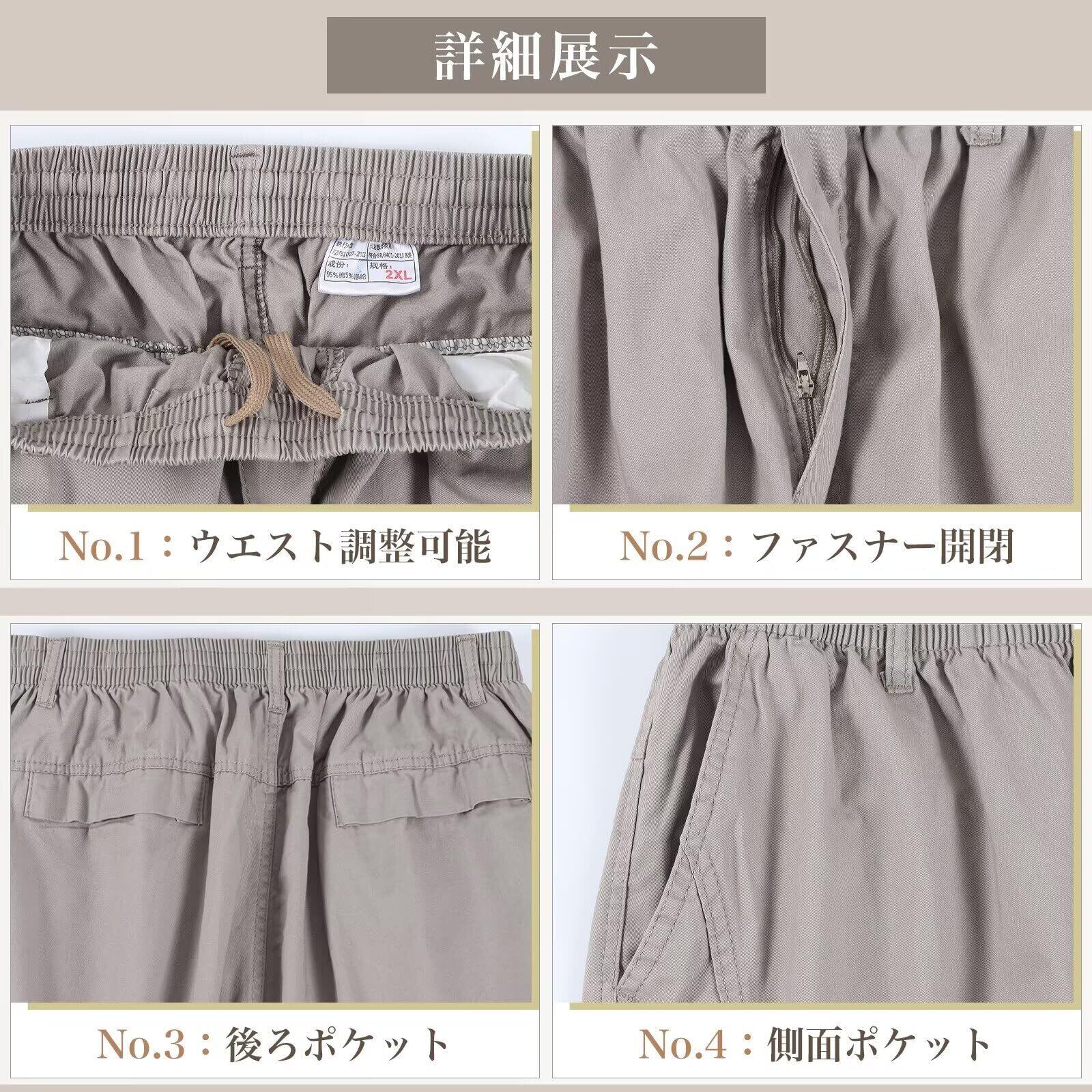 6つポケット付き」カーゴパンツは6つポケットがあり、鍵や携帯などの小物が収納出来ます。 ちょっとした外出には手ぶらで出かけられて便利です。両脚側面のポケットにはファスナー付きで、おしゃれ、実用性と便利性を備えた大きいサイズハーフパンツです。(ご注意:2016.ver右太もものチャックは飾りで、バックポケットがマジックテープを使われています。)