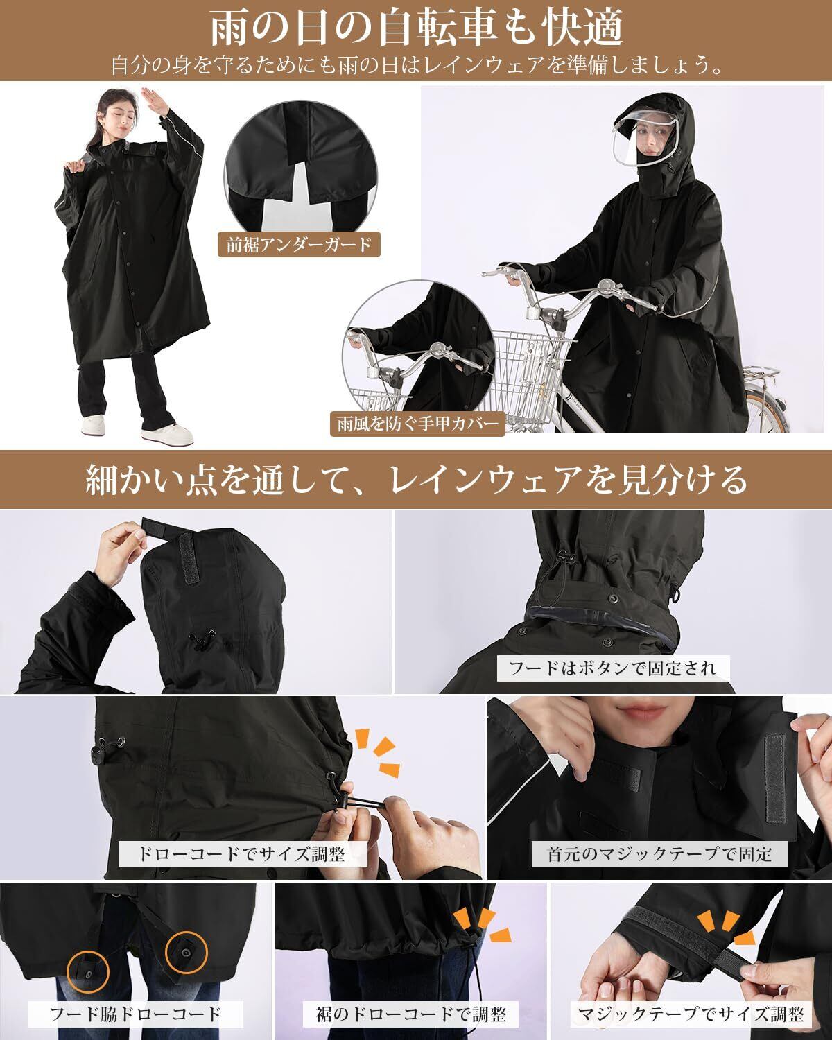 【調整可能な袖口、反射ストリップ、ロング丈自転車用レインコート】ゴム入り袖口とマジックテープでフィット感を自在に調整でき、雨水や風の侵入を防ぎます。手の甲をカバーする防水パネルにより、ライディング中に手が濡れることを防止。ロング丈 自転車カッパのデザインが体全体をしっかりとカバーし、足元から跳ね上がる雨水を効果的にガードします。さらに、前後の反射ストリップが夜間の視認性を高め、安全性を確保します。