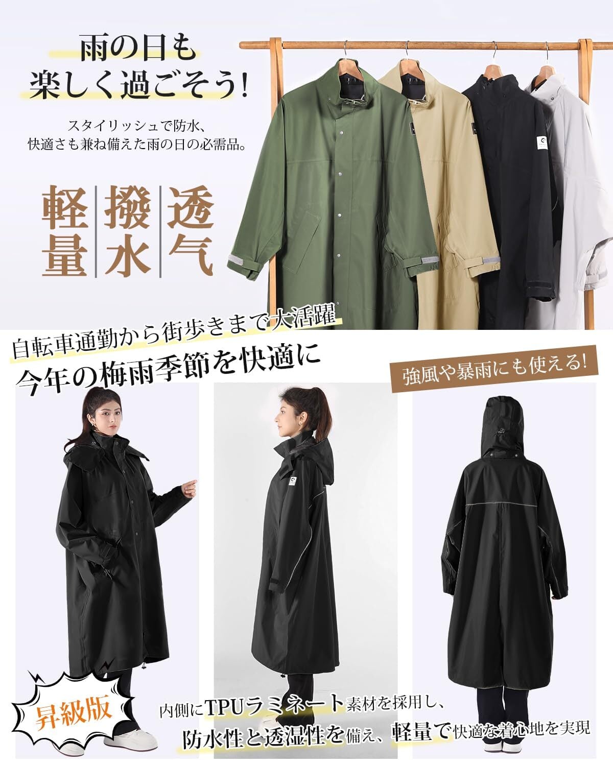 HINOKAZE レインコート 自転車【軽量構造×TPU高耐水仕様】 レディースレインウェア メンズカッパ レインポンチョ ロング 大人 バイクカッパ かっぱ ポンチョ リュック対応 おしゃれ 多機能 防風防水 丈夫 通勤通学 男女兼用 反射テープ
