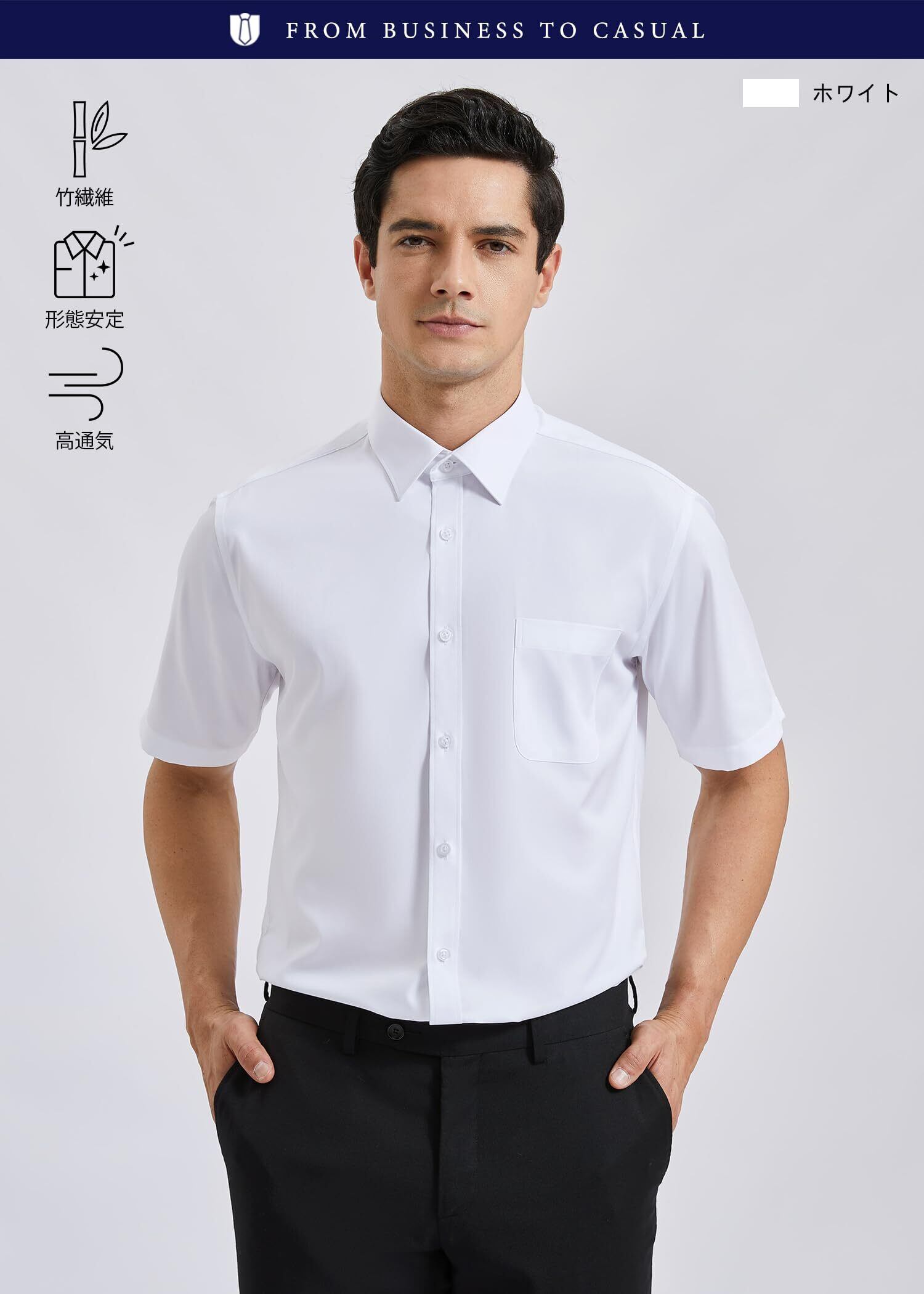 HISDERN 新登場 301B「接触冷感」竹繊維 抗菌防臭 形態安定 ワイシャツ 半袖 イージーケア 快適 高通気 速乾 ノーアイロン 微ストレッチ レギュラーフィット ビジネス/60番