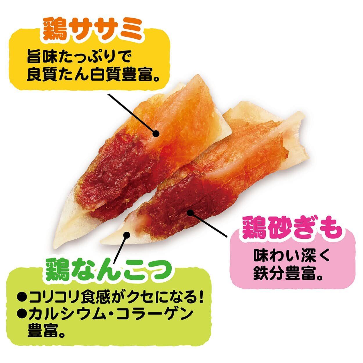 コリコリ食感がクセになる鶏なんこつを旨味たっぷりなササミと味わい深い砂ぎもで巻きました。気になる着色料・発色剤不使用で、素材そのままがうれしいダブル巻きです。農林水産省認定鳥加熱処理工場製造。
