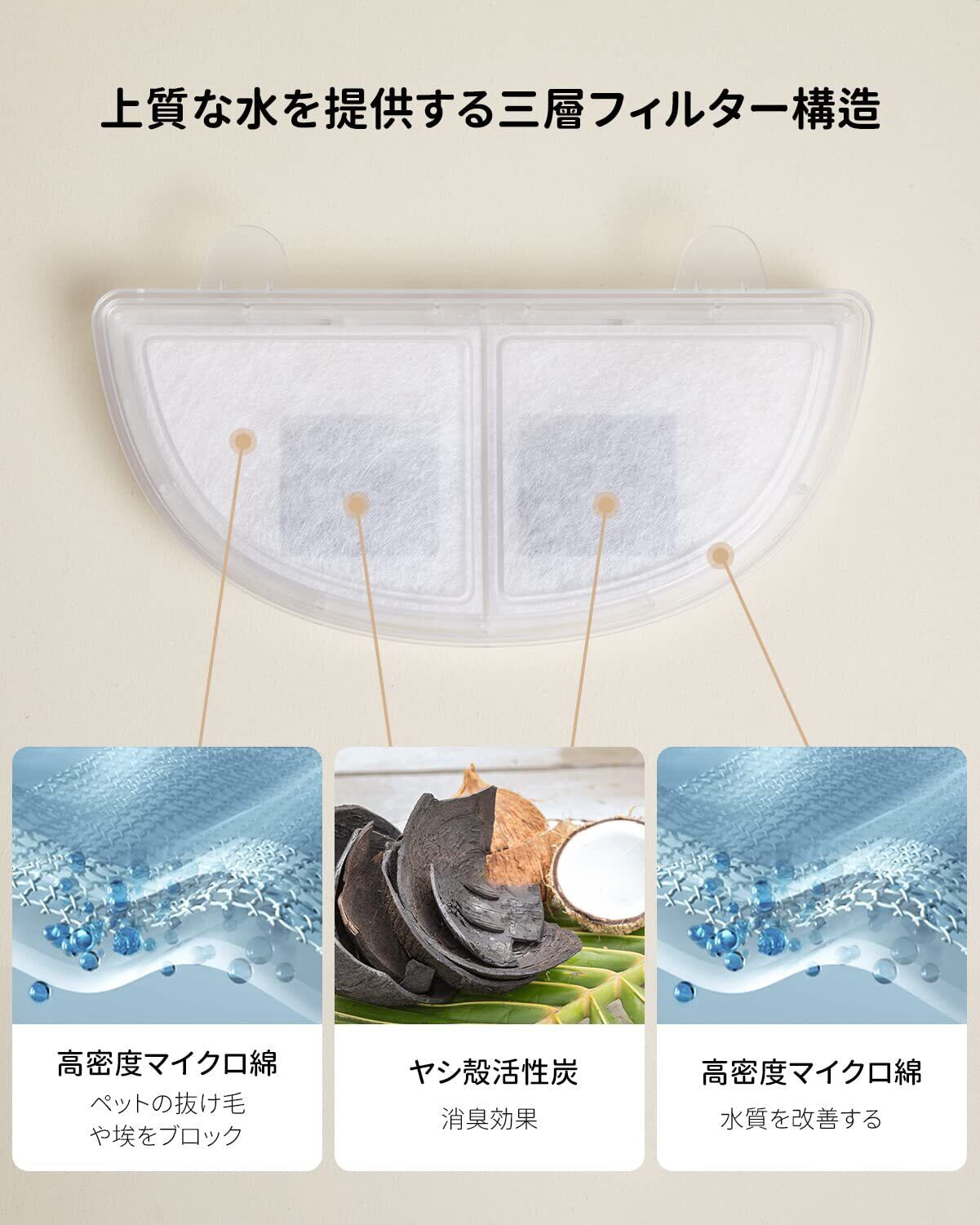 三層構造:ヤシ殻活性炭の層を高密度マイクロ綿で挟んだ三層構造です。目では見えにくいペットの抜け毛や埃だけでなく、重金属や塩素も濾過します。これにより、猫や犬が清潔な水を飲むことができ、尿路感染のリスクを低減します。
