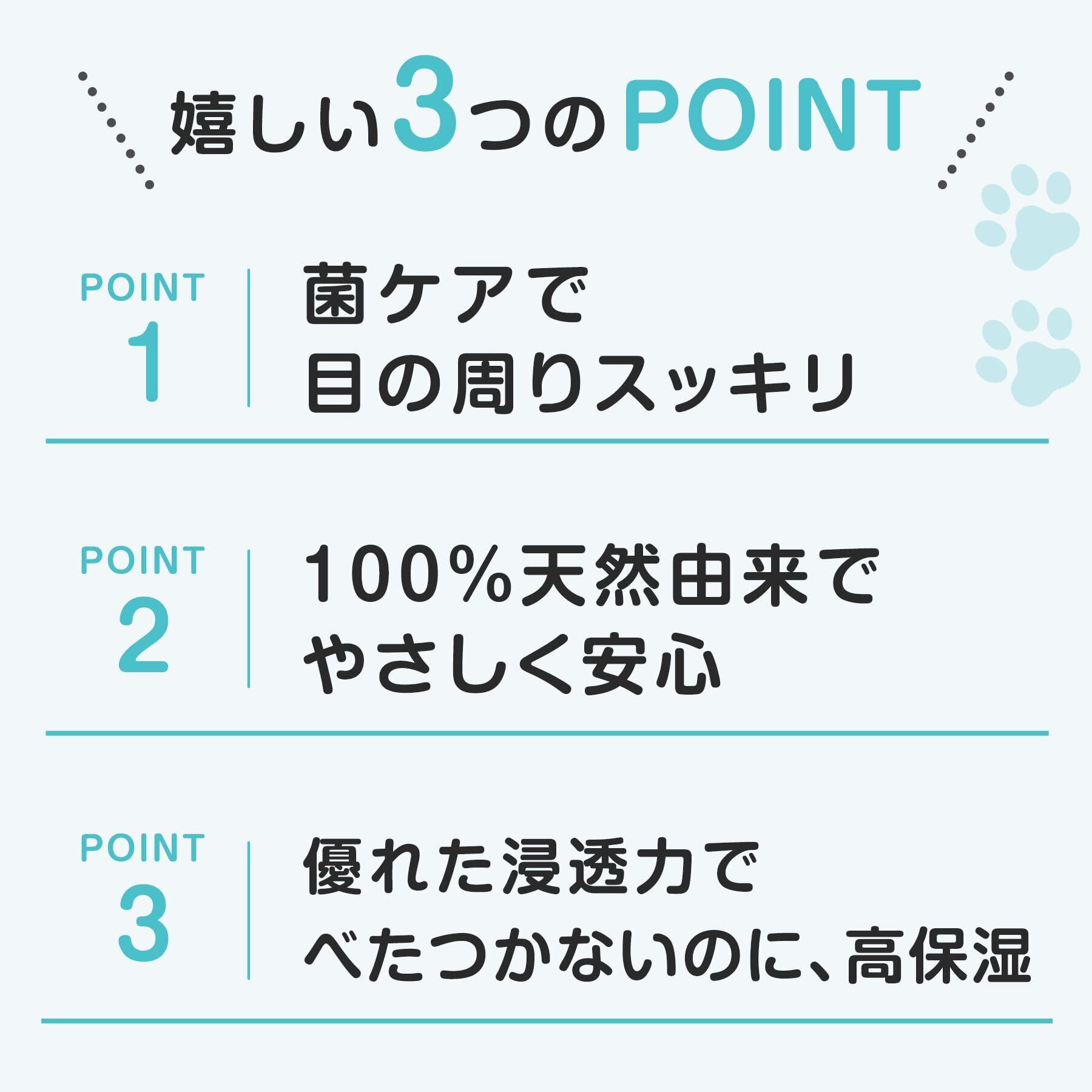 【安心安全の成分処方】 なんと成分は3つだけ。 ①フムスエキス、②水、③フェノキシエタノール。人の手を全く加えておらず、完全無添加です。 だからパピーからシニア犬までどんなワンちゃんのどの部位でも安心して使用することができます。
