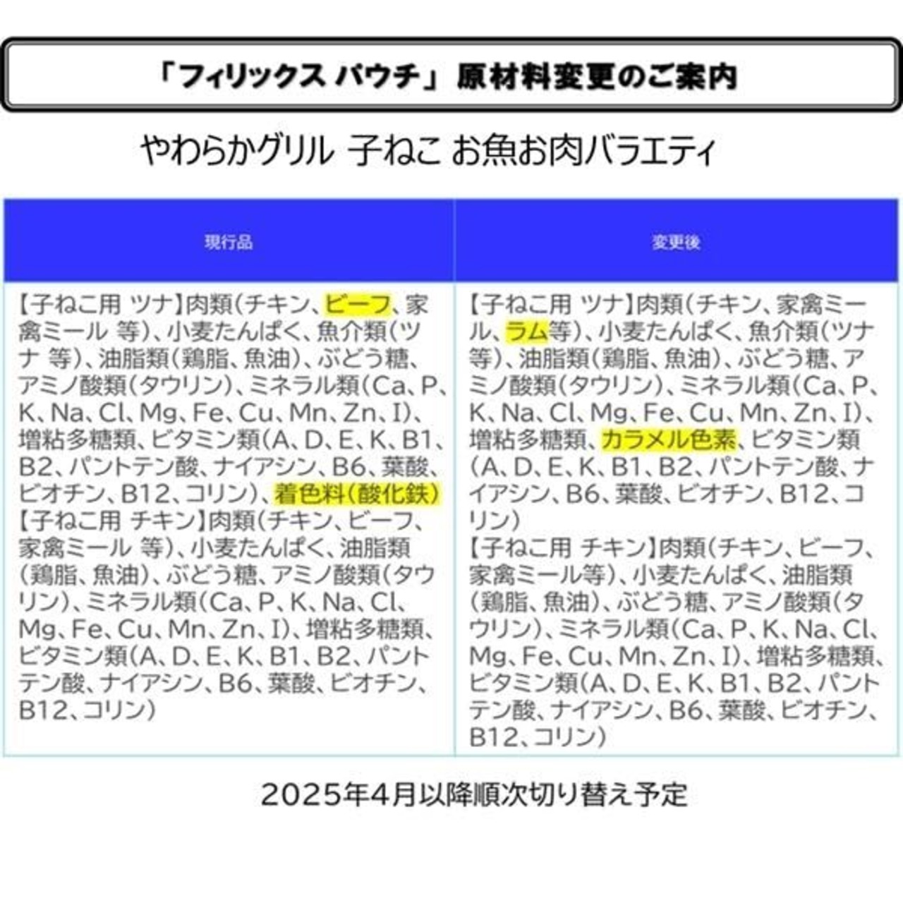 原材料:【子ねこ用 ツナ】肉類(チキン、家禽ミール、ラム等)、小麦たんぱく、魚介類(ツナ等)、油脂類(鶏脂、魚油)、ぶどう糖、アミノ酸類(タウリン)、ミネラル類(Ca、P、K、Na、Cl、Mg、Fe、Cu、Mn、Zn、I)、増粘多糖類、カラメル色素、ビタミン類(A、D、E、K、B1、B2、パントテン酸、ナイアシン、B6、葉酸、ビオチン、B12、コリン) 【子ねこ用 チキン】肉類(チキン、ビーフ、家禽ミール等)、小麦たんぱく、油脂類(鶏脂、魚油)、ぶどう糖、アミノ酸類(タウリン)、ミネラル類(Ca、P、K、Na、Cl、Mg、Fe、Cu、Mn、Zn、I)、増粘多糖類、ビタミン類(A、D、E、K、B1、B2、パントテン酸、ナイアシン、B6、葉酸、ビオチン、B12、コリン)