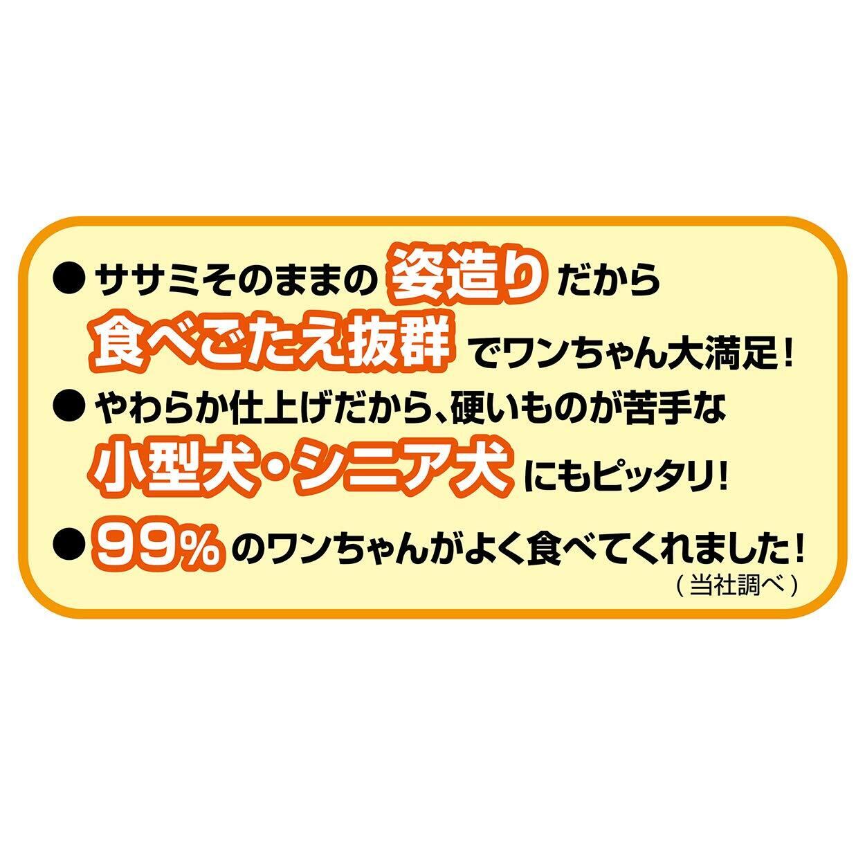 ササミそのままの姿造りだから食べごたえ抜群でワンちゃん大満足!やわらか仕上げだから、硬いものが苦手な小型犬・シニア犬にもピッタリ!着色料不使用。農林水産省認定 鳥加熱処理工場製造。便利な2袋分包。
