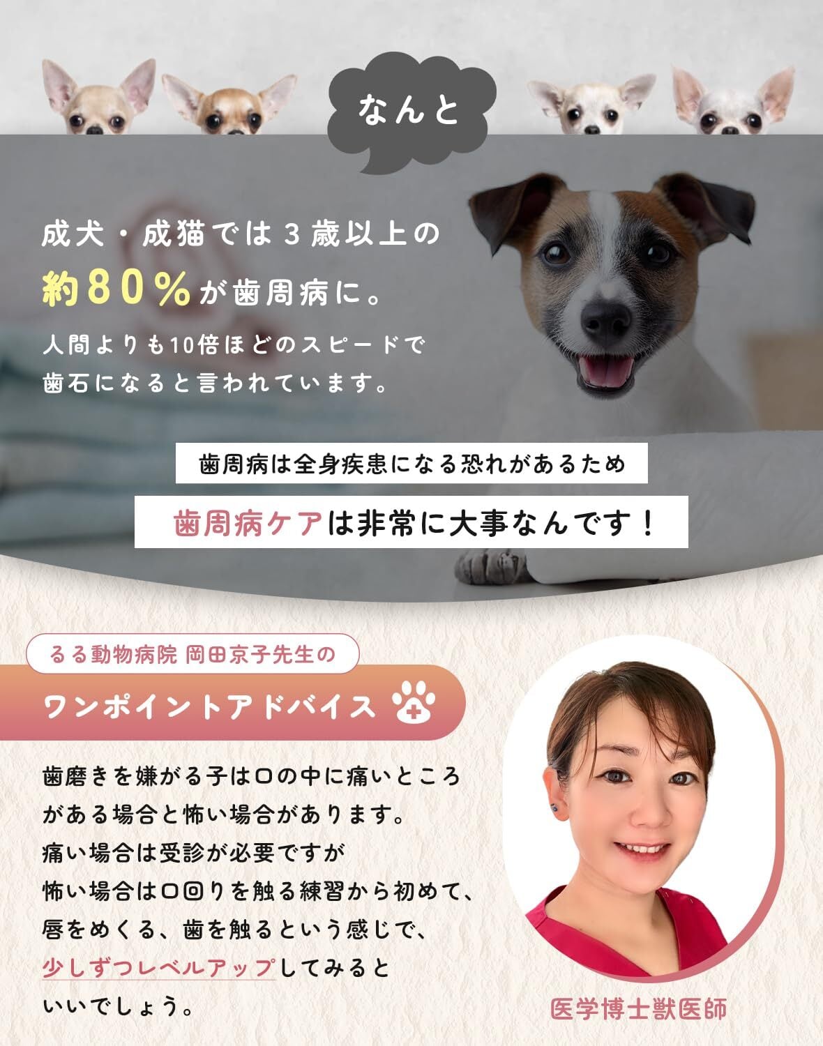 【歯周病ケアの重要性】成犬・成猫では3歳以上の約80%が歯周病に。人間よりも10倍ほど早く歯石になると言われており、歯周病ケアは非常に大切です。