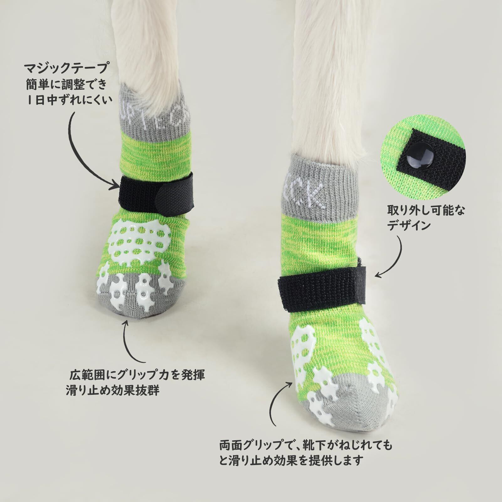 【犬用靴下の機能】犬用靴下は、犬の足元に優れたトラクションを提供し、鋭い爪から家具(フローリング、木製テーブル、ソファなど)を守ります。また、暑い舗装や冬の寒さから犬の足を保護し、痛みや擦り傷を防ぎます。さらに、爪の裂けや傷を防ぎ、舐めるのを防止する効果もあります。これらの靴下はシニア犬にも最適です。