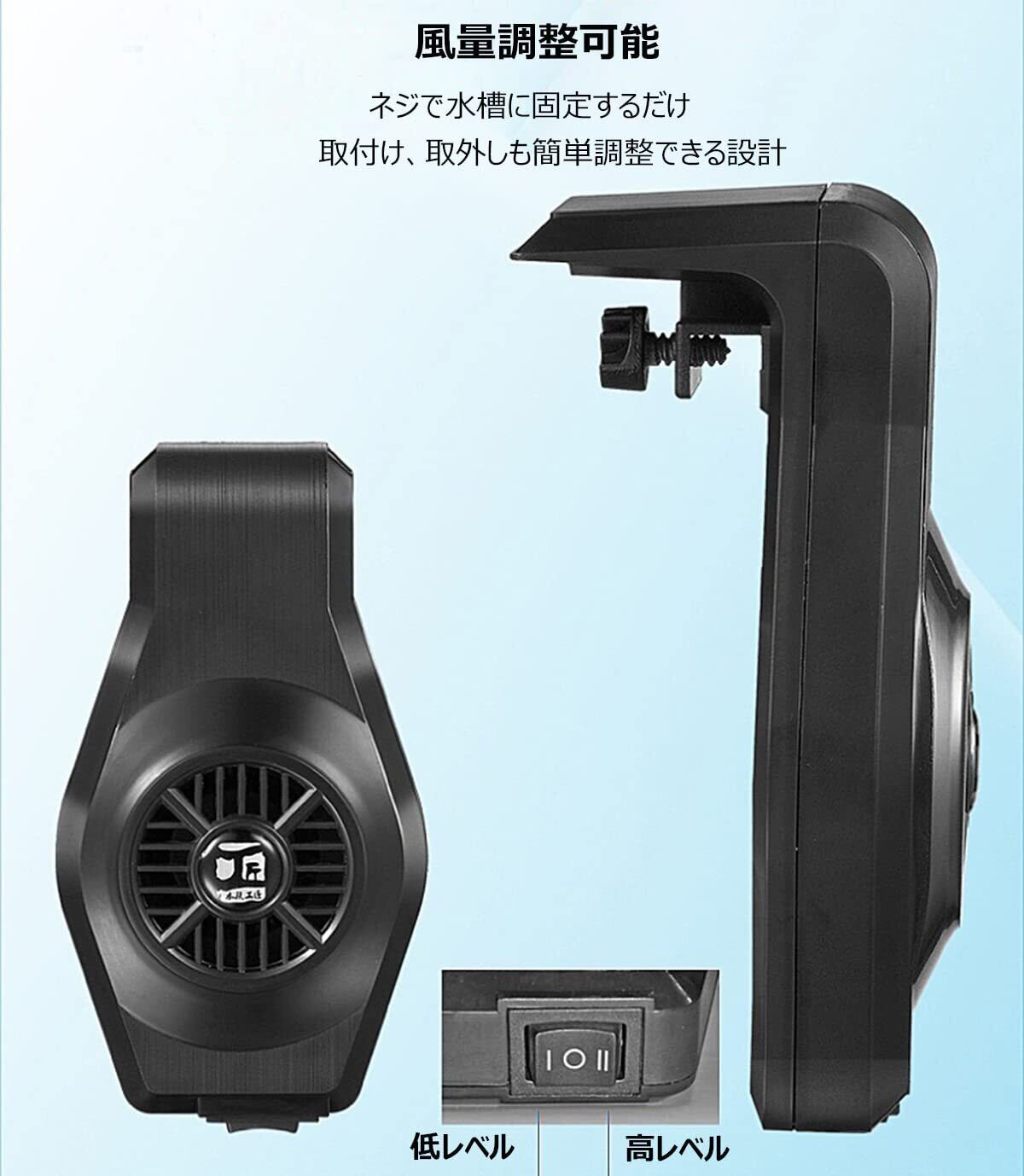 「風量調整可能」 2段階風量調整可能な水槽 クーラーです、ご必要に応じて簡単に選択できます。水温上昇防止に大活躍のクールファンシリーズ、水面への強力送風で水温は2〜4℃に下がることができます。