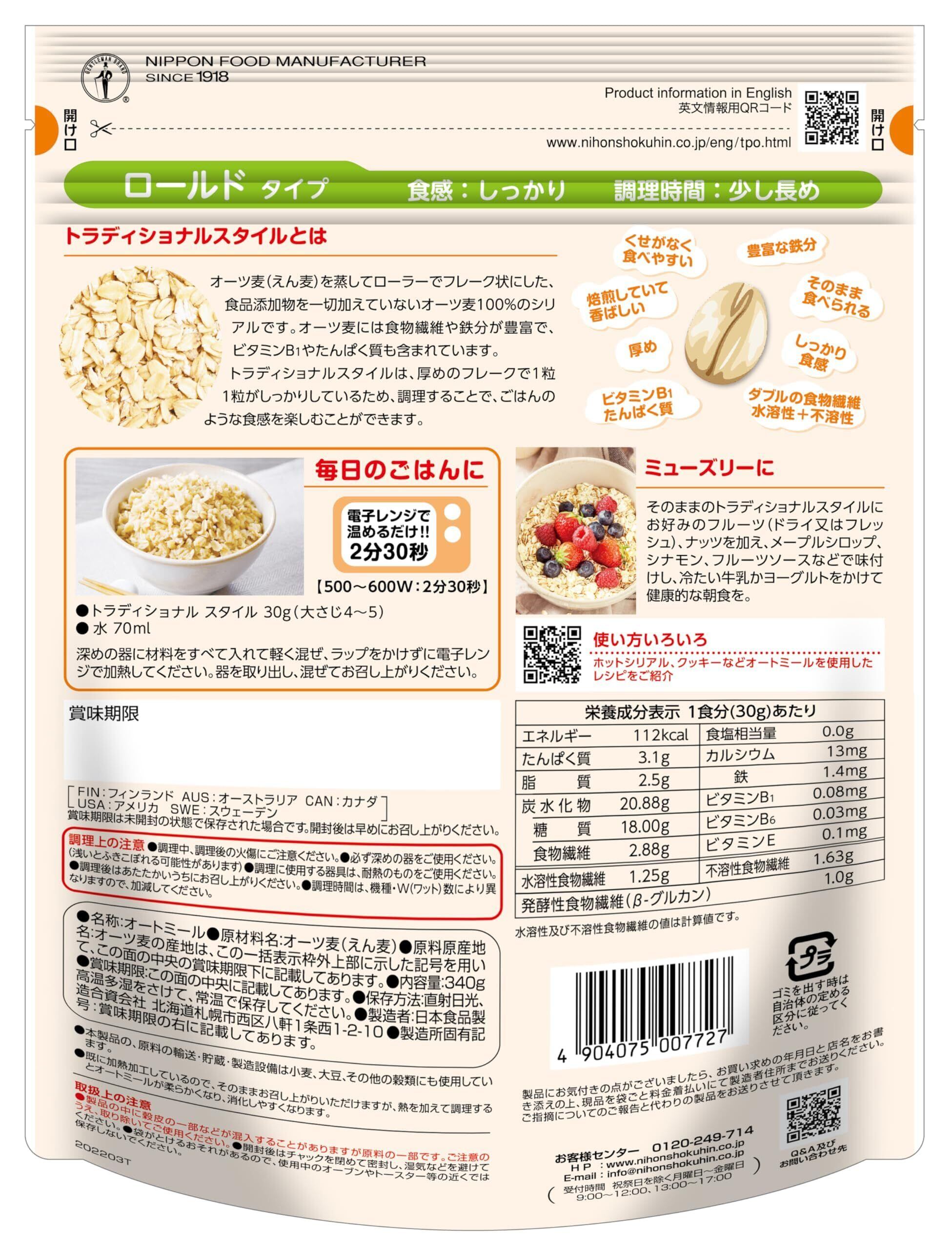 日食 プレミアム ピュア トラディショナルオートミール 340g ×4個( ロールドタイプ 国内製造 無添加 糖質ひかえめ 日本食品製造 )