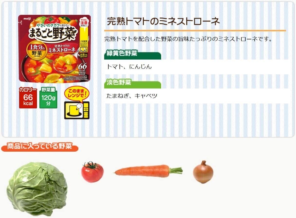 原材料:野菜(たまねぎ、じゃがいも、キャベツ、にんじん、さやいんげん、セロリ、にんにく)、ソテートマト(トマト、たまねぎ、植物油脂、にんにく、食塩)、トマトペースト、ポークエキス、砂糖、動物油脂、でん紛、食塩、酵母エキス、チーズ、たんぱく加水分解物、デキストリン、粉末しょうゆ、香辛料、バジル、脱脂粉乳、チキンエキス、調味料'(アミノ案等)、(原材料の一部に小麦、ゼラチンを含む)