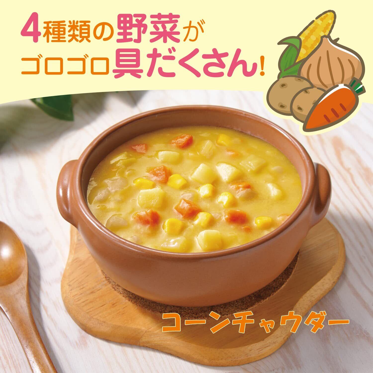 【具だくさんクリームチャウダー】:野菜(じゃがいも(中国)、たまねぎ、にんじん、スイートコーン)、濃縮乳、鶏肉、クリーミングパウダー、砂糖、クリーム、チーズパウダー、チキンブイヨン、バター、食塩、チキンブイヨンパウダー、チキンエキスパウダー、たん白加水分解物、たまねぎエキス、香味油、香辛料、酵母エキス/増粘剤(加工デンプン)、調味料(アミノ酸等)、香料、(一部に乳成分・小麦・大豆・鶏肉を含む)【具だくさんミネストローネ】:野菜(じゃがいも(中国)、たまねぎ、キャベツ、にんじん、トマト、赤ピーマン)、トマトペースト、砂糖、チキンブイヨン、炒めたまねぎペースト、食塩、たん白加水分解物、食酢、にんにくペースト、ローストガーリックシーズニング、香辛料、酵母エキス、チーズパウダー/増粘剤(加工デンプン)、調味料(アミノ酸等)、香料、(一部に乳成分・大豆・鶏肉を含む)【具だくさんコーンチャウダー】:野菜(じゃがいも(中国)、たまねぎ、スイートコーン、にんじん)、とうもろこしペースト、濃縮乳、砂糖、クリーミングパウダー、クリーム、チーズパウダー、バター、チキンブイヨン、食塩、チキンブイヨンパウダー、たまねぎエキス、たん白加水分解物、香辛料、酵母エキス/増粘剤(加工デンプン)、調味料(アミノ酸等)、香料、カロチノイド色素、(一部に乳成分・小麦・大豆・鶏肉を含む)