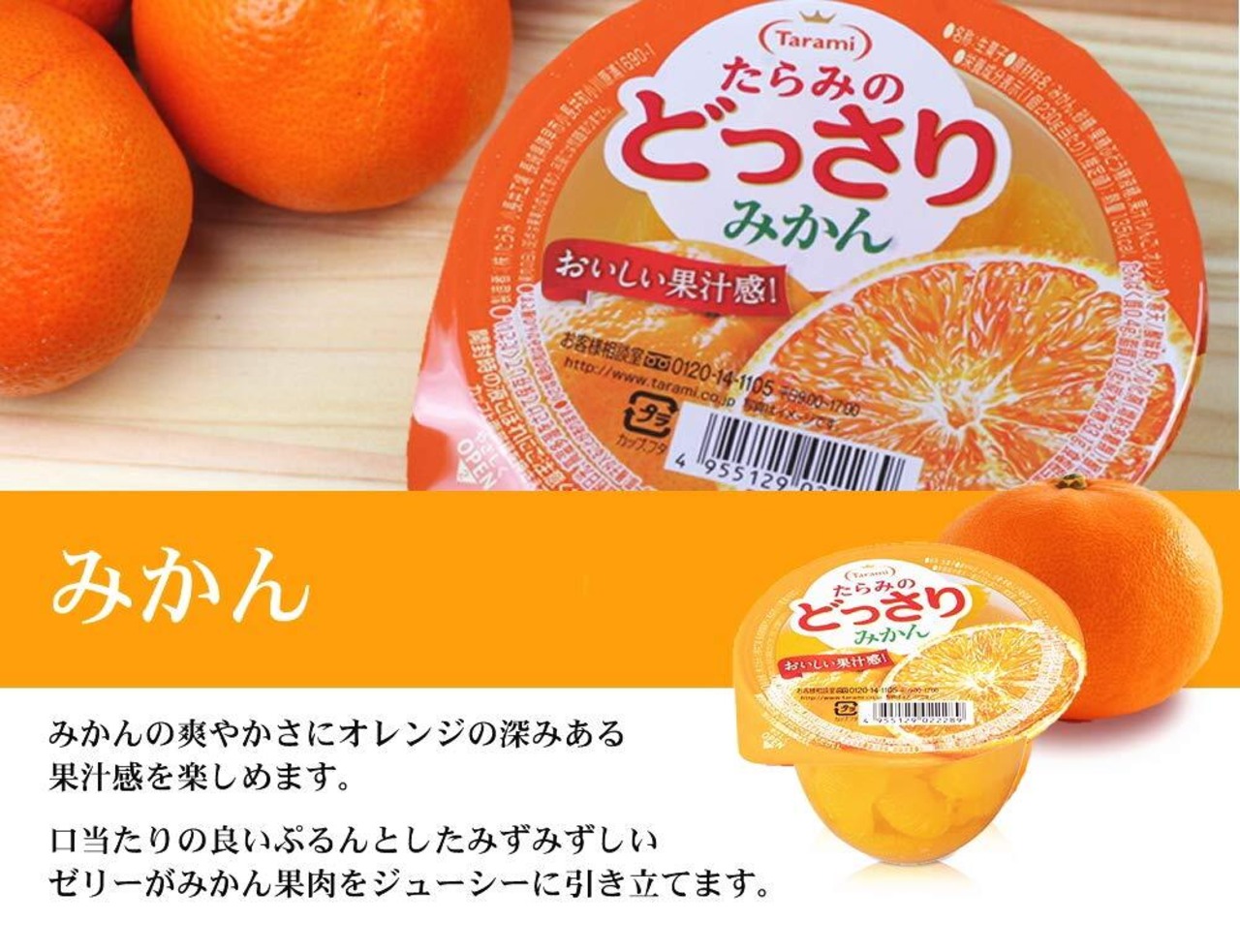 【自然の恵み、フルーツそのままの美味しさたっぷり。ぷるんとみずみずしい、“たらみのどっさり”ゼリー】自然の恵みが、いつでもどこでも、たっぷり味わえるゼリーです。たらみが厳選したフルーツの美味しさをそのまま、すっきりとした果汁感あるゼリーに閉じ込めました。みかんの爽やかさに、オレンジの深みある果汁感をプラスした、口当たりの良い、ぷるんとしたみずみずしいゼリーが、みかん果肉をジューシーに引き立てます。