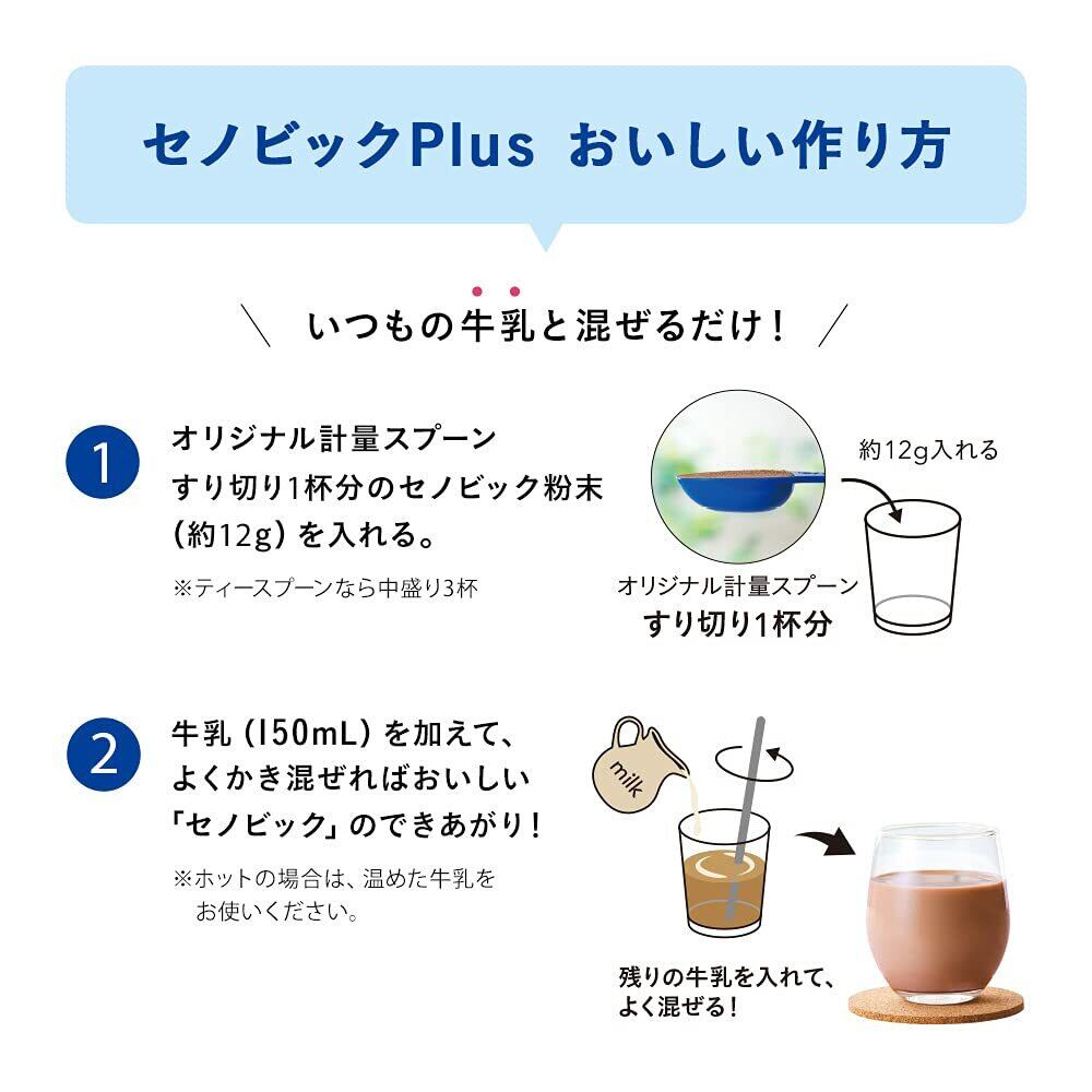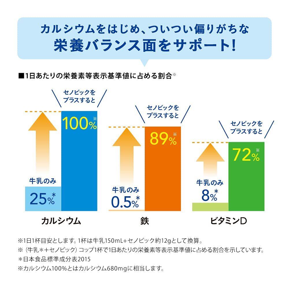 1日1杯目安とします。1杯は牛乳150mL+セノビック約12gとして換算。本品は、特定保健用食品と異なり、消費者庁長官による個別審査を受けたものではありません。 多量摂取により疾病が治癒したり、より健康が増進するものではありません。 一日の摂取目安量を守ってください。 食生活は主食、主菜、副菜を基本に、食事のバランスを