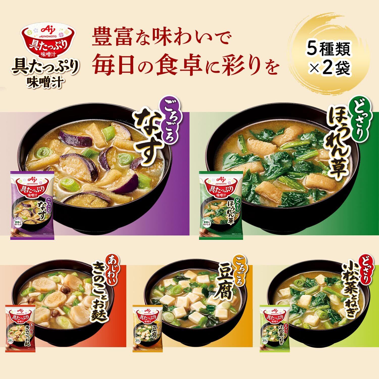 「なす」「ほうれん草」「豆腐」「きのことお麩」「小松菜とねぎ」の5種類が2袋ずつ入った10食セットです。