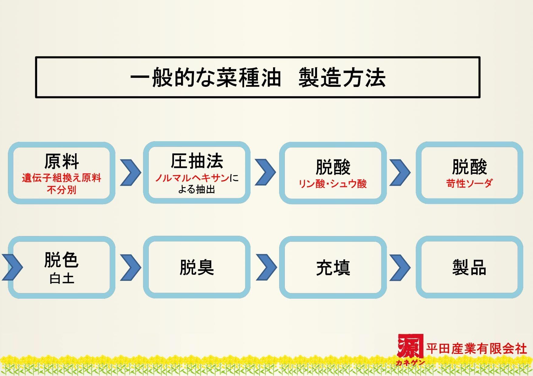 原料には,国産菜種だけを使っています。圧力で搾った搾りの油だけを贅沢に使い、不純物をお酢とお湯で洗い取り除いております。クセがなくさっぱりとしてカラッと揚がる油で、ドレッシングやマヨネーズなど生でお召し上がるお料理をはじめ、炒め物、揚げ物などの和・洋・中華などのお料理にお楽しみ頂けます。