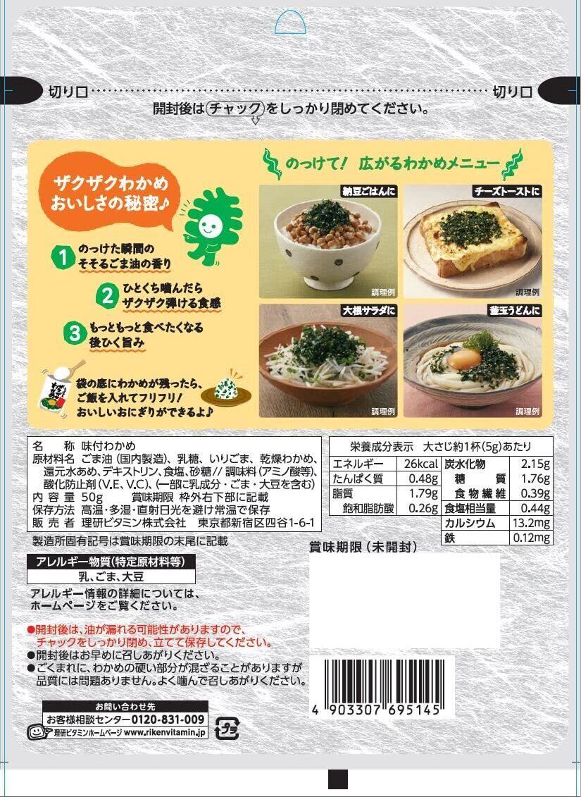 原材料:ごま油(国内製造)、乳糖、いりごま、乾燥わかめ、還元水あめ、デキストリン、食塩、砂糖//調味料(アミノ酸等)、酸化防止剤(V.E,V.C)、(一部に乳成分・ごま・大豆を含む)