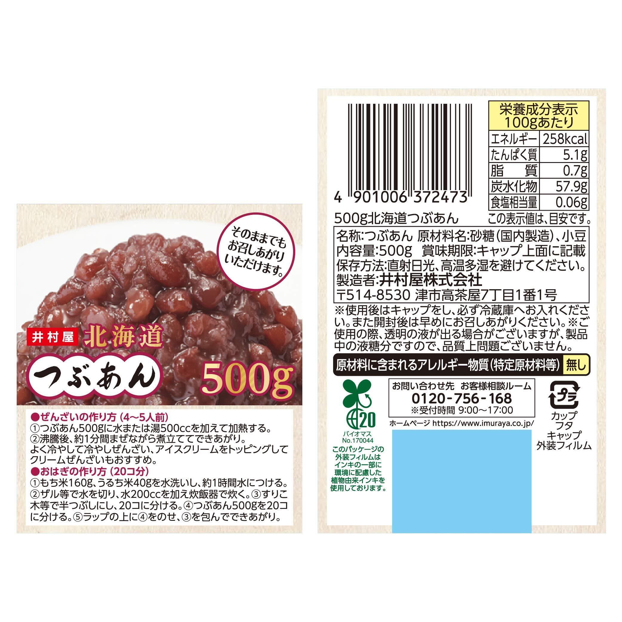 全ての原料を北海道産に限定。 北海道産小豆、北海道産ビートグラニュー糖。すっきりとした甘さで、小豆の風味豊かなつぶあん。リキャップ可能なオーバーキャップ付き 保存しやすく、使いやすい。バイオマスインキ使用(外装フィルム) インキの一部に環境に配慮したバイオマスインキを採用。バイオマスマーク表示。