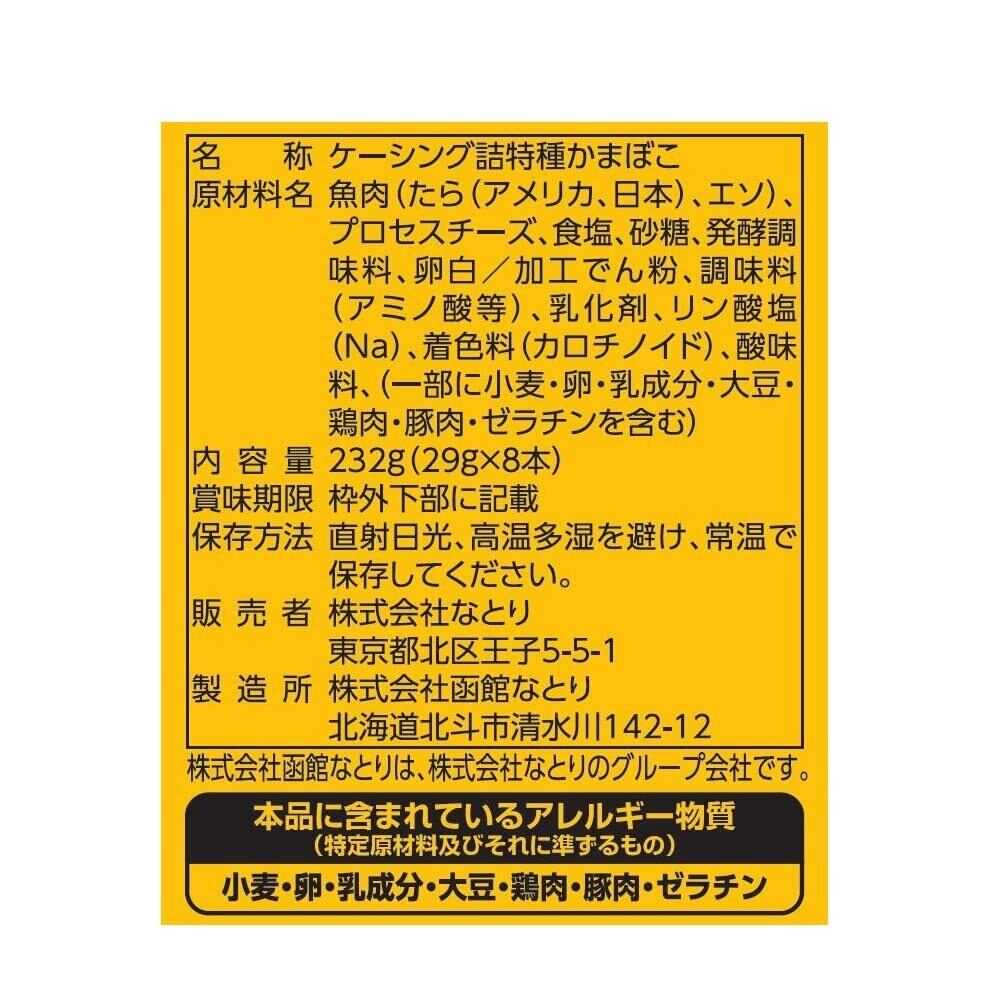 原材料:魚肉(たら(アメリカ、日本)エソ)、プロセスチーズ、食塩、砂糖、発酵調味料、卵白/加工でん粉、調味料、(一部に小麦・卵・乳成分・大豆・鶏肉・豚肉・ゼラチンを含む)