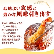 【心地よい食感と豊かな風味】米油は、食感が良くなる「リノール酸」とおいしさを引き出す「オレイン酸」をバランスよく含んでおり、素材の風味と食感が引き立つ。