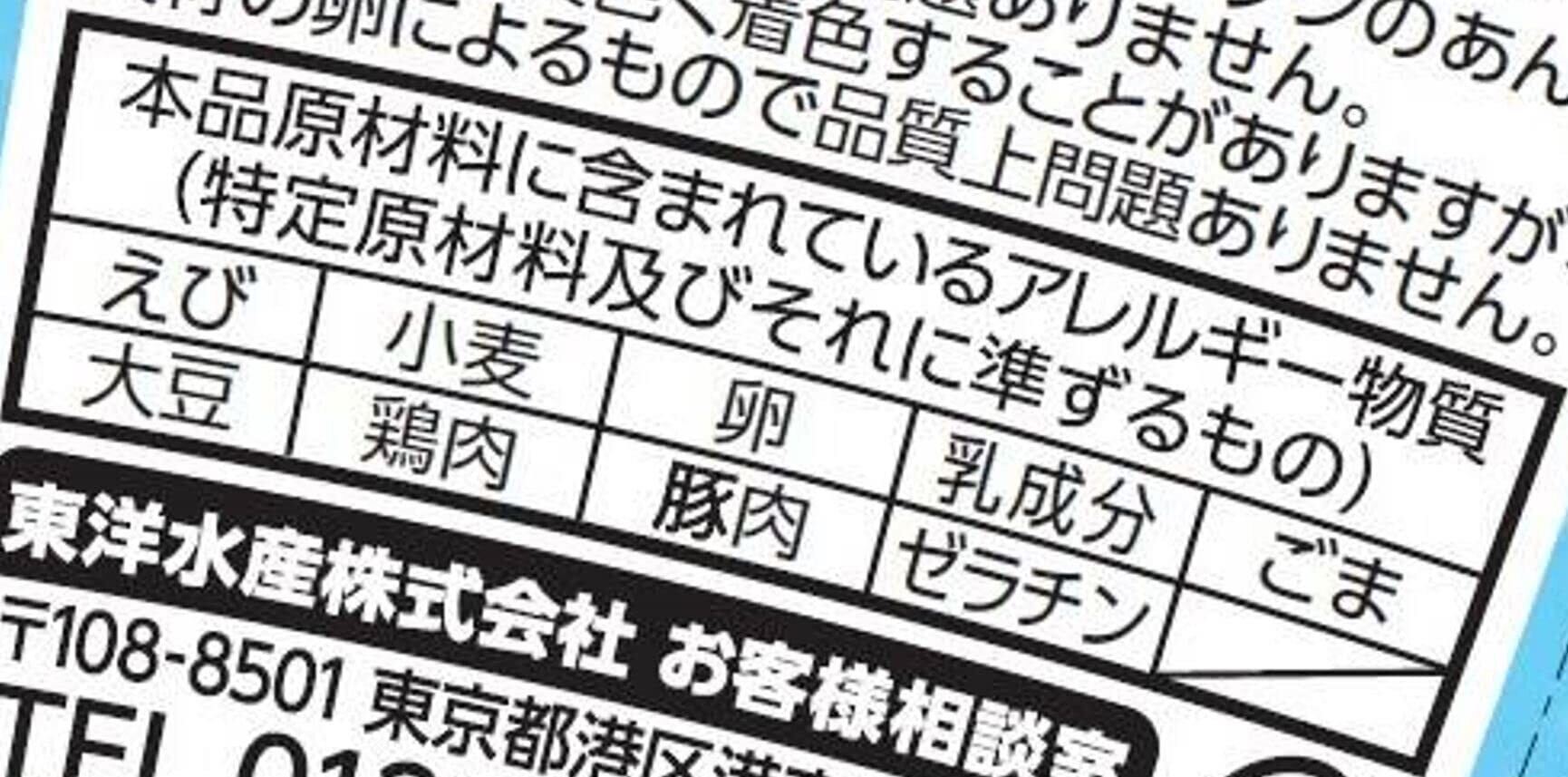 油揚げワンタン(小麦粉(国内製造)、植物油脂、味付豚肉、粉末野菜、食塩)、添付調味料(食塩、魚介エキス、チキンエキス、ごま、しょうゆ、たん白加水分解物、砂糖、香辛料、魚醤(魚介類)、ねぎ)、かやく(卵、かに風かまぼこ)/調味料(アミノ酸等)、増粘多糖類、炭酸カルシウム、香料、かんすい、酸化防止剤(ビタミンE、ローズマリー抽出物)、カロチン色素、ベニコウジ色素、パプリカ色素、(一部にえび・小麦・卵・乳成分・ごま・大豆・鶏肉・豚肉・ゼラチン・魚醤(魚介類)を含む)