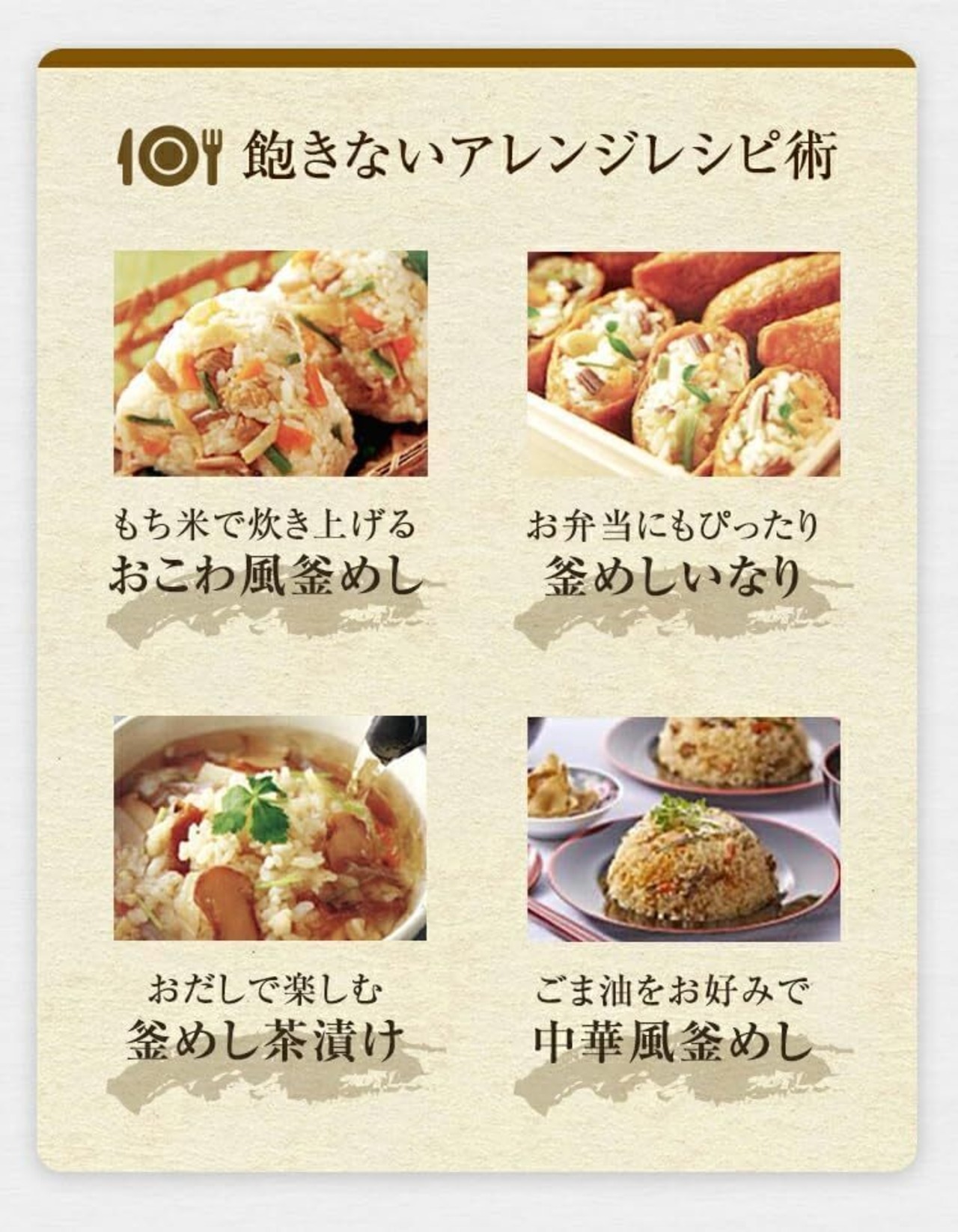 ●5種の国産素材を使用した旨みだしでだしの風味がしっかり効いた釜めしです。 ●鶏肉(国産)、ごぼう、油揚げ、乾燥ごぼう、乾燥にんじんの5種の具材入り。 ●従来品より鶏肉30%増量しました。 ●3合用(3~4人前)