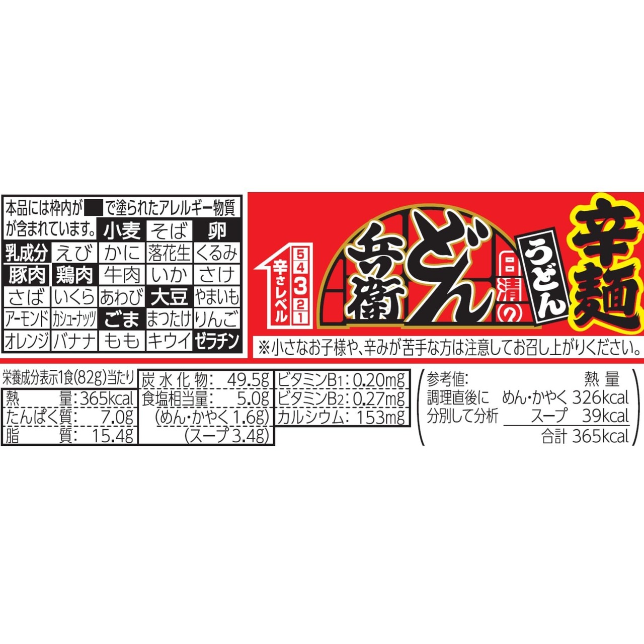 油揚げめん(小麦粉(国内製造)、植物油脂、食塩、植物性たん白、こんぶエキス、大豆食物繊維、糖類)、スープ(糖類、食塩、粉末しょうゆ、香辛料(唐辛子、にんにく、胡椒)、チキン調味料、ポーク調味料、オニオンパウダー、粉末みそ、ポークパウダー)、かやく(卵、味付肉そぼろ、にら)/加工でん粉、調味料(アミノ酸等)、増粘多糖類、炭酸Ca、リン酸塩(Na)、カラメル色素、カロチノイド色素、微粒二酸化ケイ素、香辛料抽出物、セルロース、pH調整剤、香料、酸化防止剤(ビタミンE、ローズマリー抽出物)、乳化剤、甘味料(スクラロース、アセスルファムK)、ビタミンB2、ビタミンB1、(一部に小麦・卵・乳成分・ごま・大豆・鶏肉・豚肉・ゼラチンを含む)