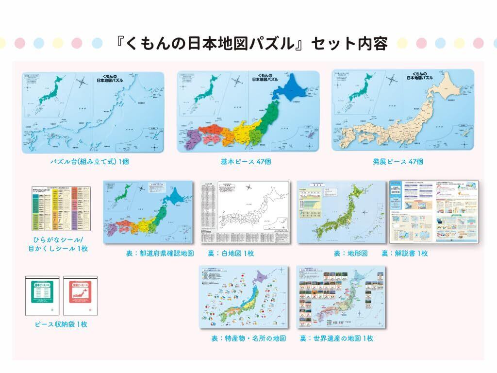 セット内容:パズル台(組み立て式)1個、基本ピース47個、発展ピース47個、都道府県名確認地図(裏:白地図)1枚、地形図(裏:解説書)1枚、特産物・名所の地図(裏:世界遺産の地図)1枚、ひらがなシール(めかくしシール)1枚、ピース収納袋2枚