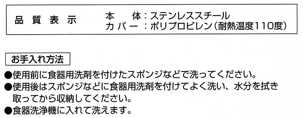 <b>材質:</b> 本体/ステンレススチール、カバー/ポリプロピレン(耐熱温度 110度)