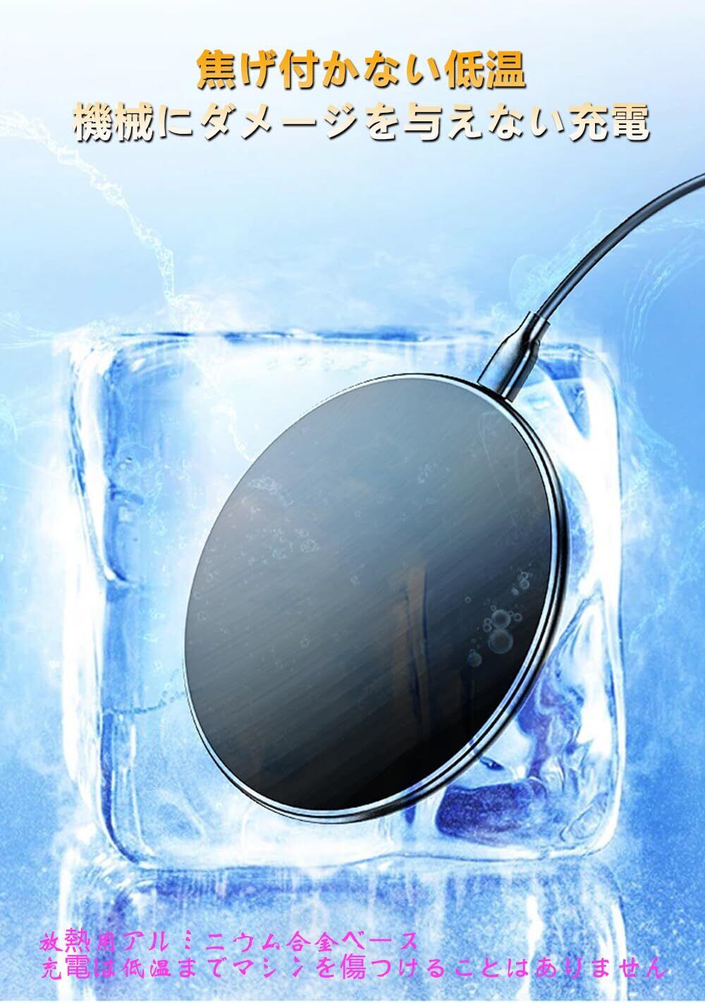 【購入前の注意事項】 5V/ 1Aを使用する場合、マックスの出力電力は5Wだけです。 充電が遅くなったり、充電ができなくなったりします。 当社の製品に合わせて、QC2.0以上のアダプターを使用することをお勧めします。 iphoneは80%の充電に達したら、バッテリーの耐久性を保つため、トリクルモードに入ります。 5Wの電力で充電します。 本製品を購入する前に、お使いの携帯電話がワイヤレス充電機能に対応していることをご確認ください。 5mm以上の厚みがあるケースや金属製や革のケースや磁気を帯びたケースおよびクレジットカードを付ける場合、充電前に、取り外してください。 過熱のおそれがあるため、スマートフォンとワイヤレス充電器の間にものを置かないでください(例:車載用マウントの金属パッド、クレジットカード、鍵、小銭、金属、NFCカードなど)。