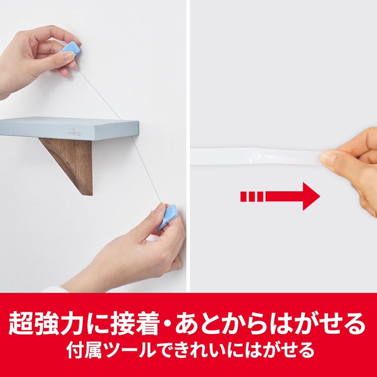 【超強力なのにあとからはがせる両面テープ! 】しっかり固定できて、キズつけずにあとからキレイにはがせる超強力両面テープ。付属のはがしツールでテープを分断することで、貼ったものを取り外すことができます。