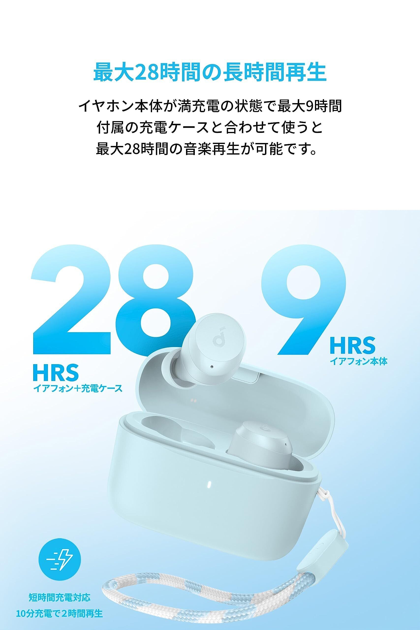 最大28時間長時間再生:イヤホン本体が満充電の状態で最大9時間、付属の充電ケースを合わせて使うと、最大28時間の音楽再生が可能です。また10分間の充電で約2時間分の音楽再生が可能です。