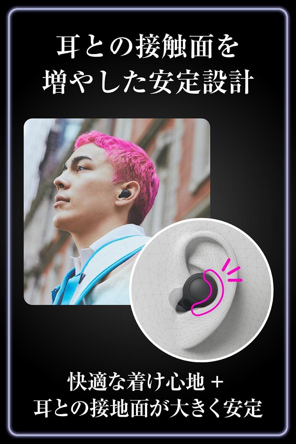 本体及びケースをコンパクトに設計。耳からの出っ張りを抑えることで装着感を高め、スマートな装着姿を実現します。長時間のリスニングでも疲れにくい快適な装着性を実現しています。さらにトレンドのくすみカラーを採用した、ラベンダー、セージグリーンとベーシックなホワイト・ブラックからファッションに合わせてお選びいただけます。