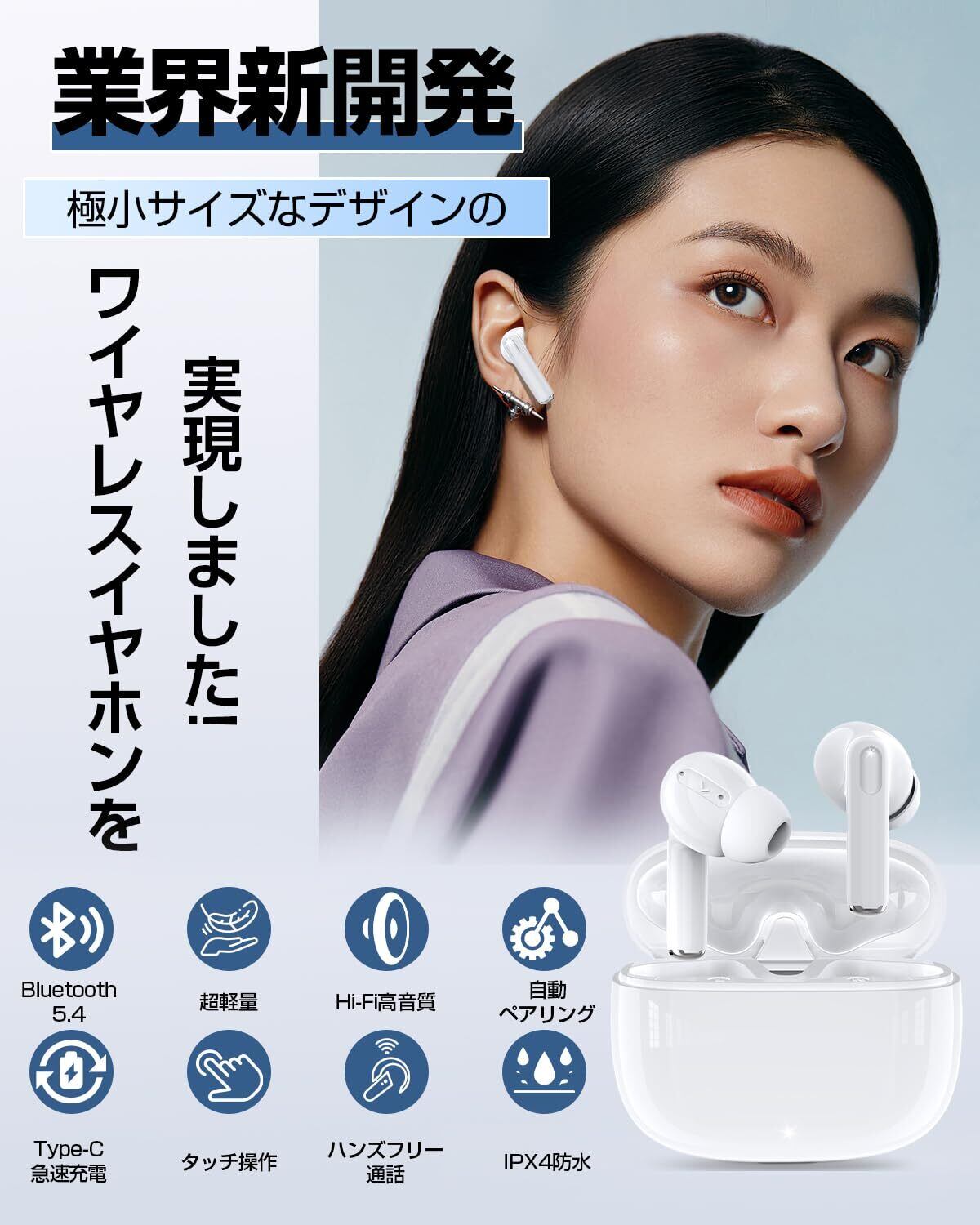イヤホン bluetooth ワイヤレスイヤホン Blueooth 5.4 ブルートゥースイヤホン Type-C急速充電 ENC通話ノイズキャンセリング 自動ペアリング 小型/軽量 快適な装着感 マイク付き IPX4防水/防滴 Hi-Fi音質 超軽量設計 タッチ式音量調整 iOS/Android対応 コンパクト/テレワーク/通勤/音楽/通学/スポーツ/WEB会議