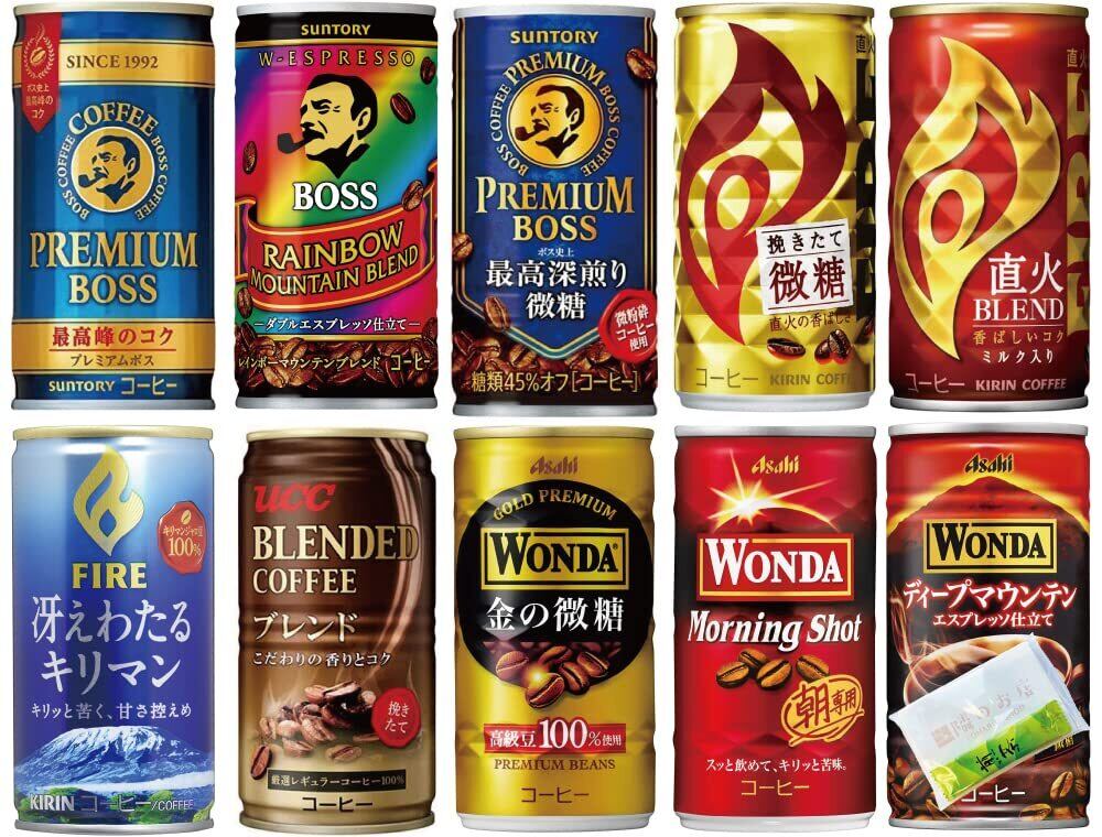 内容:ワンダーモーニングショット185g、金の微糖185g、ワンダ ディープマンテン185g、UCC ブレンドコーヒー 185g、コーヒーボスレインボーマウンテンブレンド185g、プレミアムボス微糖185g、プレミアムボス185g、ファイア直火ブレンド185g、ファイア挽きたて微糖185g、ファイア冴えわたるキリマン185g 各3缶セット