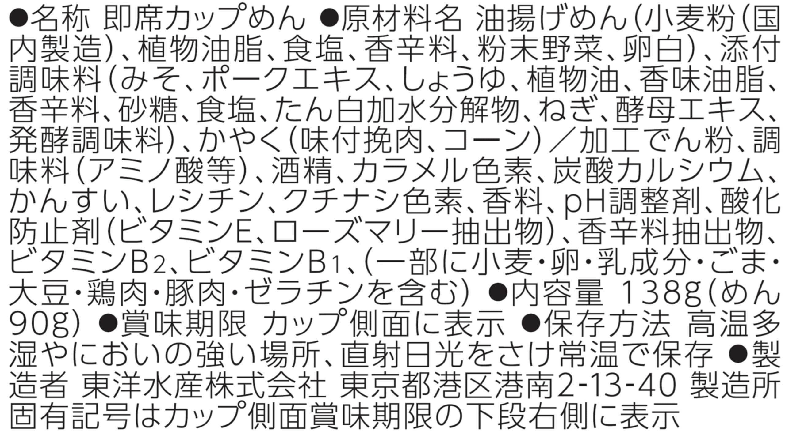 油揚げめん(小麦粉(国内製造)、植物油脂、食塩、香辛料、粉末野菜、卵白)、添付調味料(みそ、ポークエキス、しょうゆ、植物油、香味油脂、香辛料、砂糖、食塩、たん白加水分解物、ねぎ、酵母エキス、発酵調味料)、かやく(味付挽肉、コーン)/加工でん粉、調味料(アミノ酸等)、酒精、カラメル色素、炭酸カルシウム、かんすい、レシチン、クチナシ色素、香料、pH調整剤、酸化防止剤(ビタミンE、ローズマリー抽出物)、香辛料抽出物、ビタミンB2、ビタミンB1、(一部に小麦・卵・乳成分・ごま・大豆・鶏肉・豚肉・ゼラチンを含む)