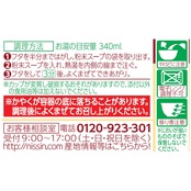 【1】フタを半分まではがし、粉末スープの袋を取り出す。【2】粉末スープを入れ、熱湯を内側の線まで注ぐ。【3】フタをして3分後、よくまぜてできあがり。