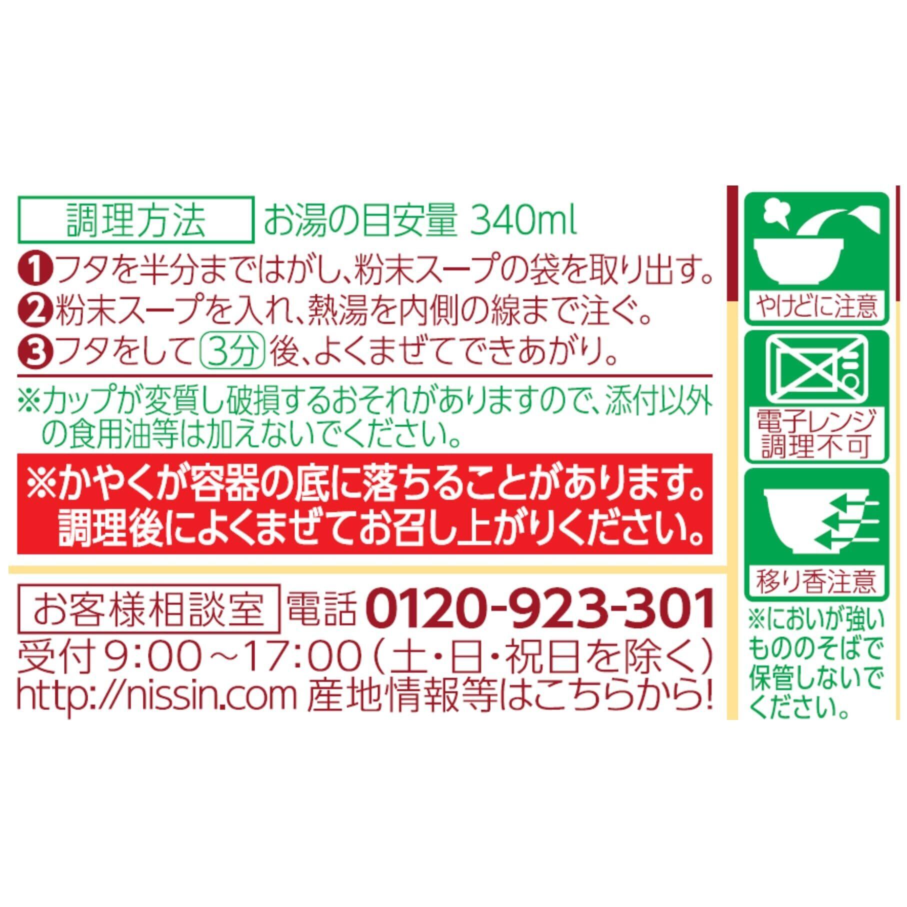 油揚げめん(小麦粉(国内製造)、そば粉、植物油脂、食塩、植物性たん白、しょうゆ)、スープ(糖類、食塩、かつおぶし調味料、粉末しょうゆ、魚粉、オニオン調味料、たん白加水分解物、デキストリン、わかめ、七味唐辛子、こんぶ粉末)、かやく(揚げ玉、かまぼこ)/加工でん粉、調味料(核酸等)、リン酸塩(Na)、カラメル色素、炭酸Ca、酸味料、香料、酸化防止剤(ビタミンE)、ベニコウジ色素、チャ抽出物、クチナシ色素、ビタミンB2、ビタミンB1、(一部にえび・小麦・そば・卵・乳成分・さば・大豆を含む)