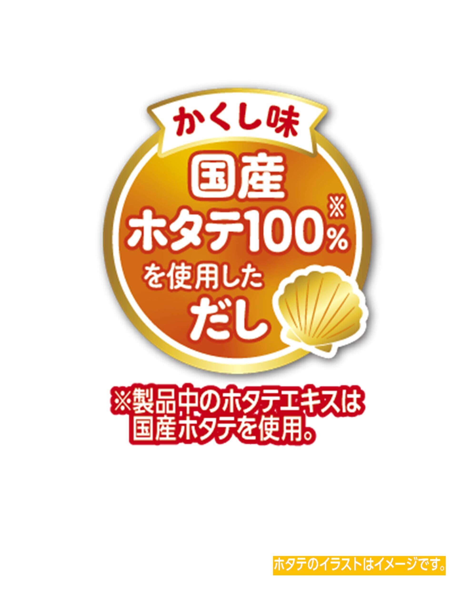 "かくし味はホタテだし!そのだしに使用しているホタテを100%国産化! めん・スープ・スパイスにホタテが入っていることでの 旨みと香りが織りなす三重奏、“ホッとする”味わいをお楽しみください。"