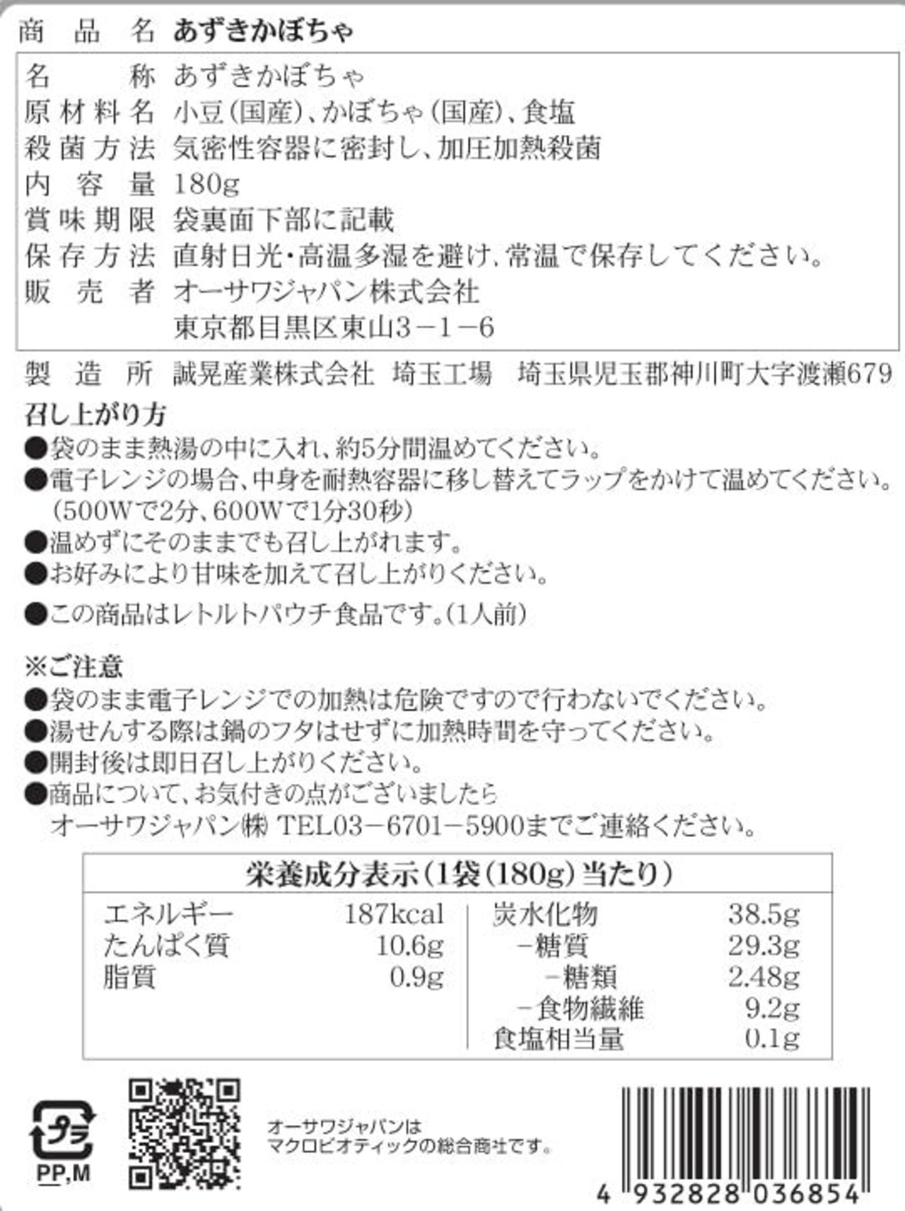 原材料:特別栽培小豆・かぼちゃ(国内産)、食塩(海の精)