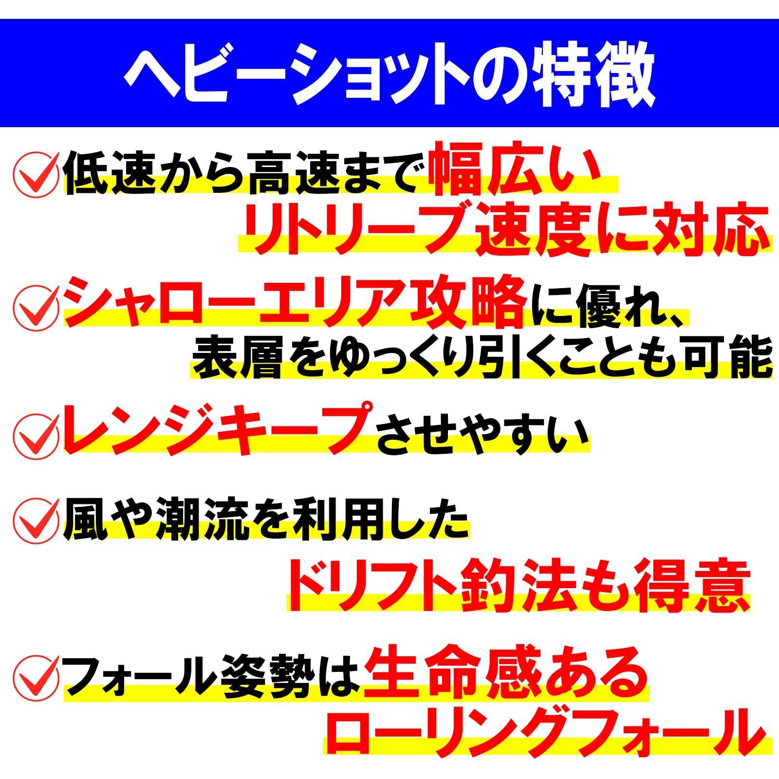 ■極小リップがしっかり水を掴んで、水面直下のハイスピードリトリーブができる!■バイトを誘発する前進しながらのローリングフォール(シミーフォール)。■逆風でも負けない圧倒的な遠投性能。