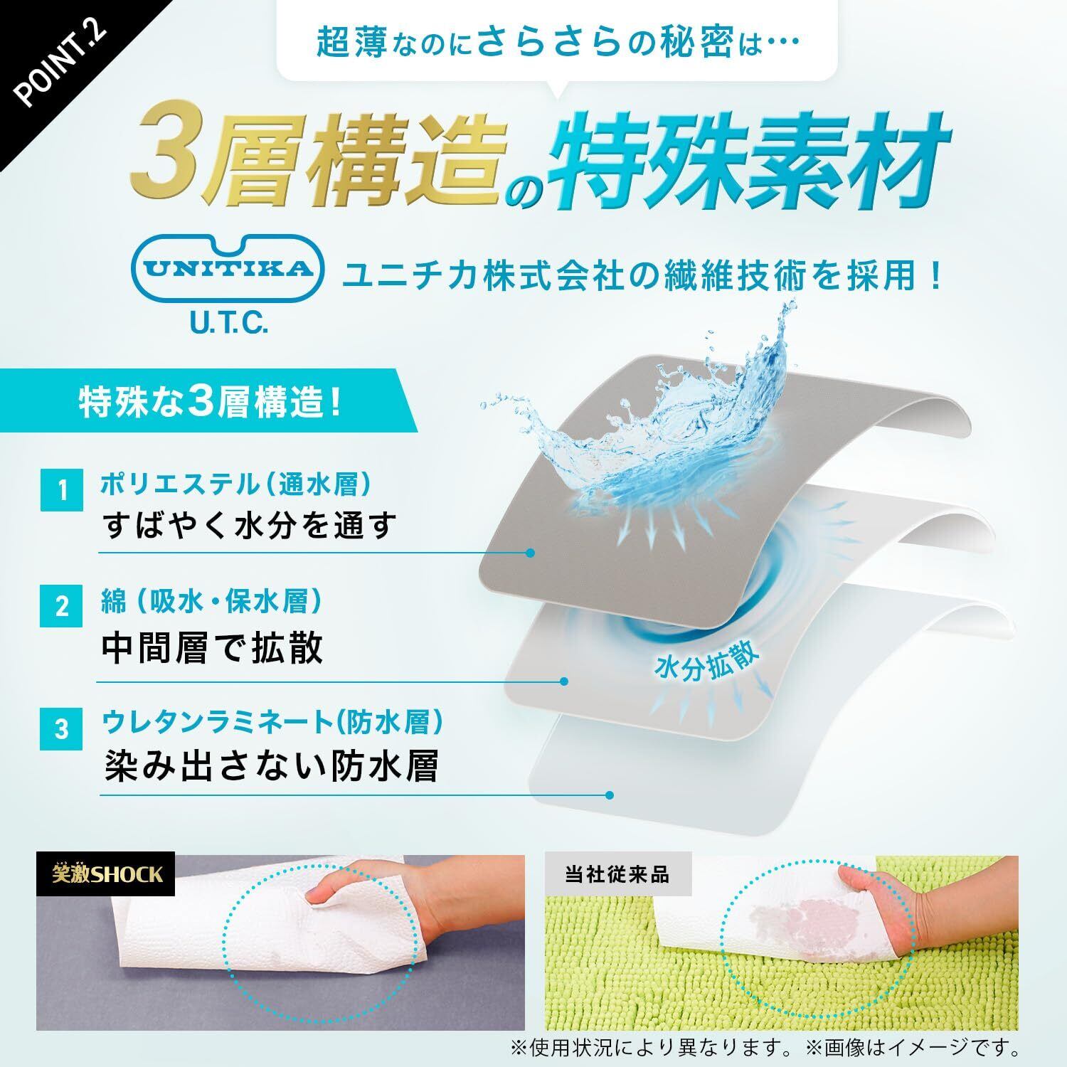 驚異の1秒吸水!2~3人が続けて使用できる吸水力です。裏地には防水加工がされています。