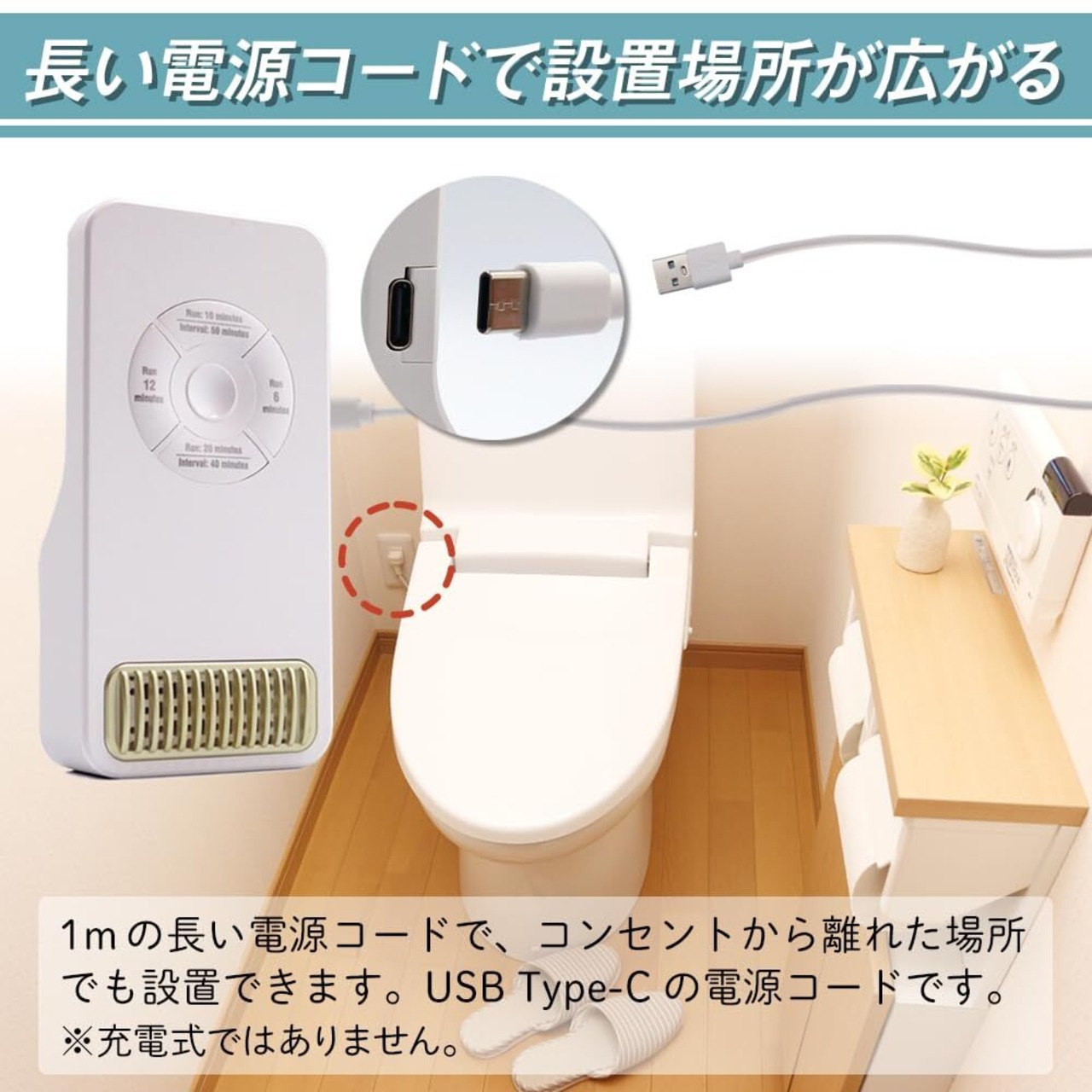 使用範囲3~10畳、内蔵バッテリー無し、電源コードタイプUSB Type-C(約1m)。トイレやペットの匂いを強力消臭!玄関の消臭機としても活躍。