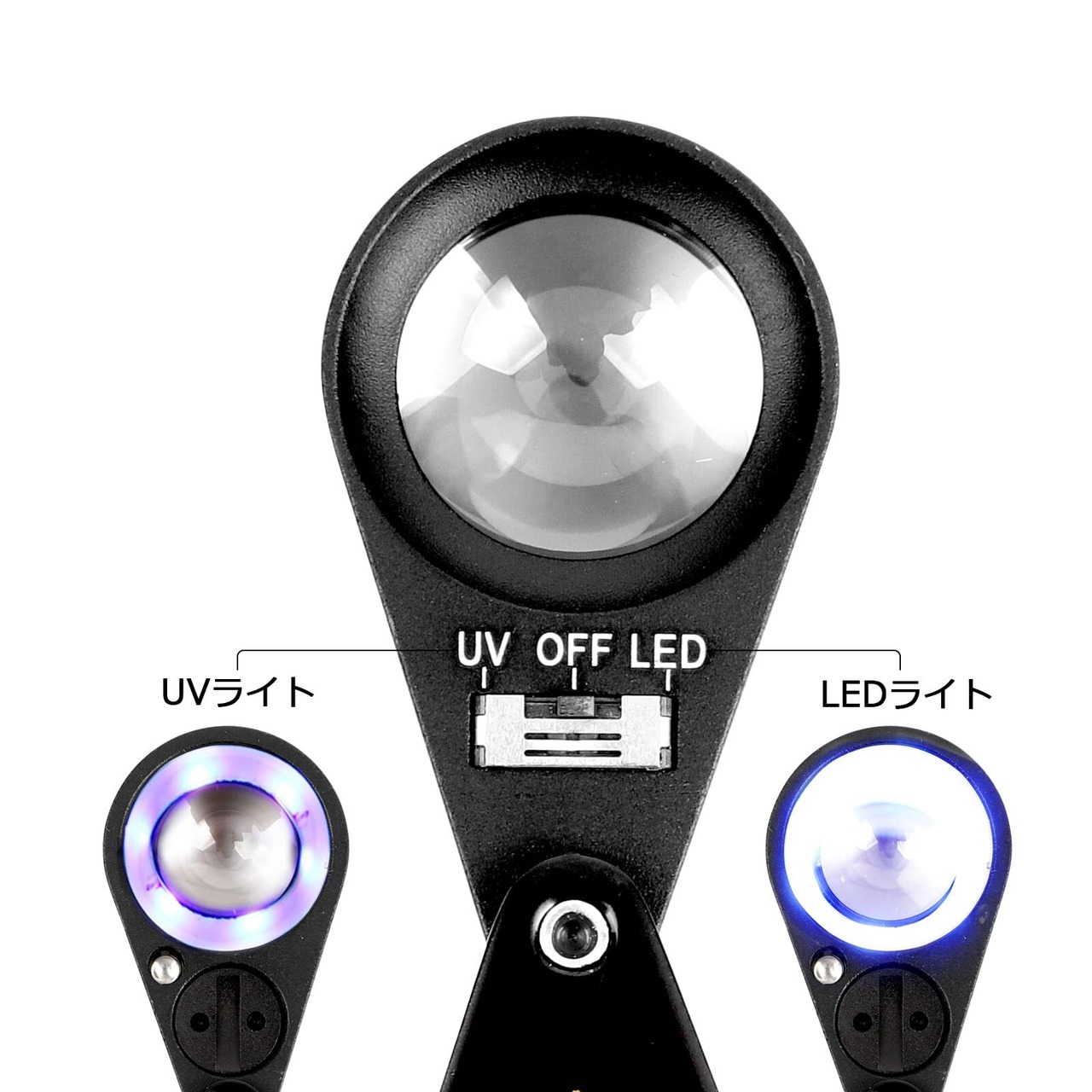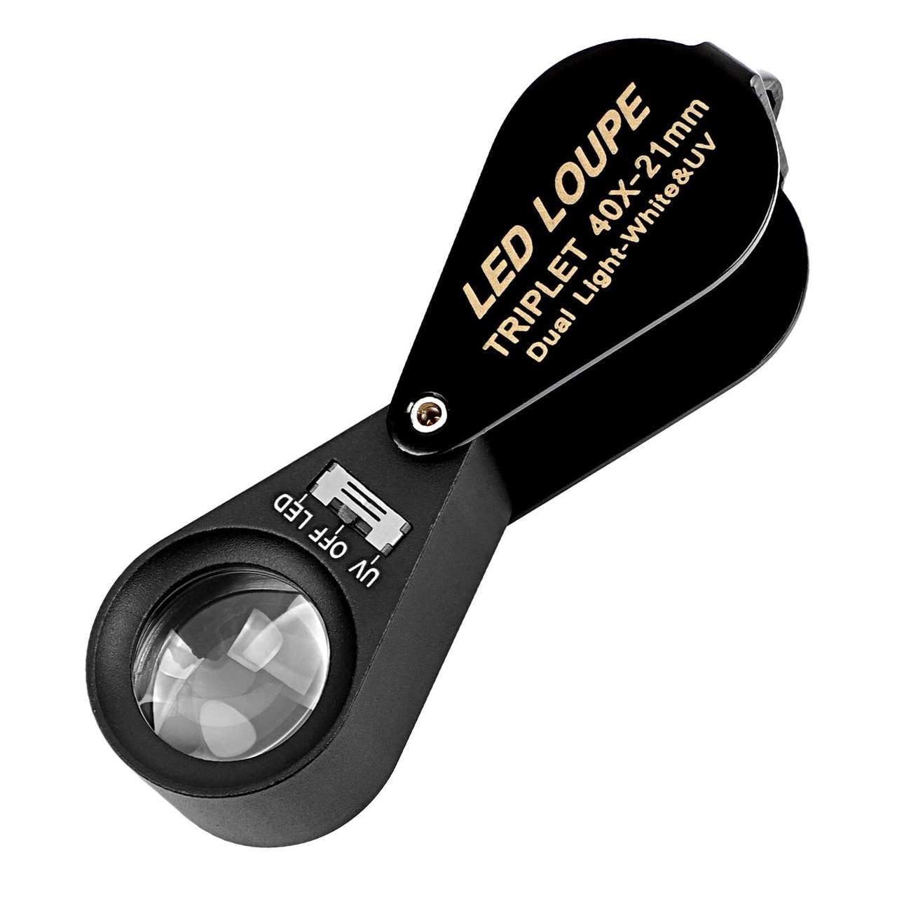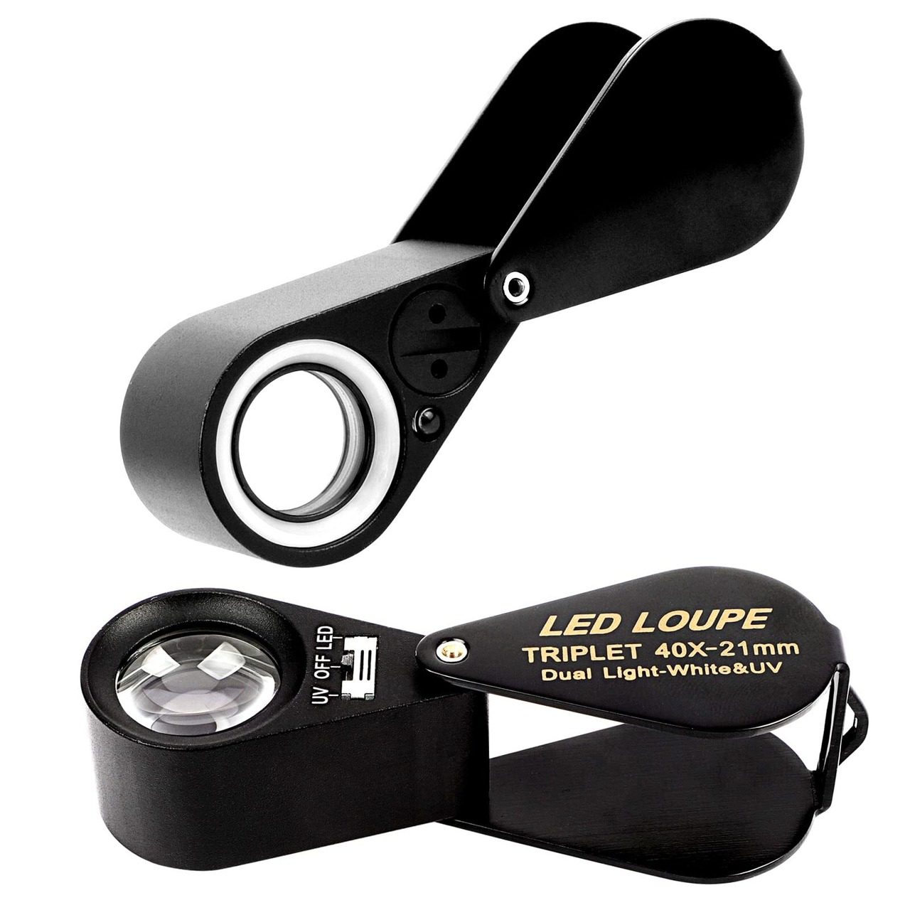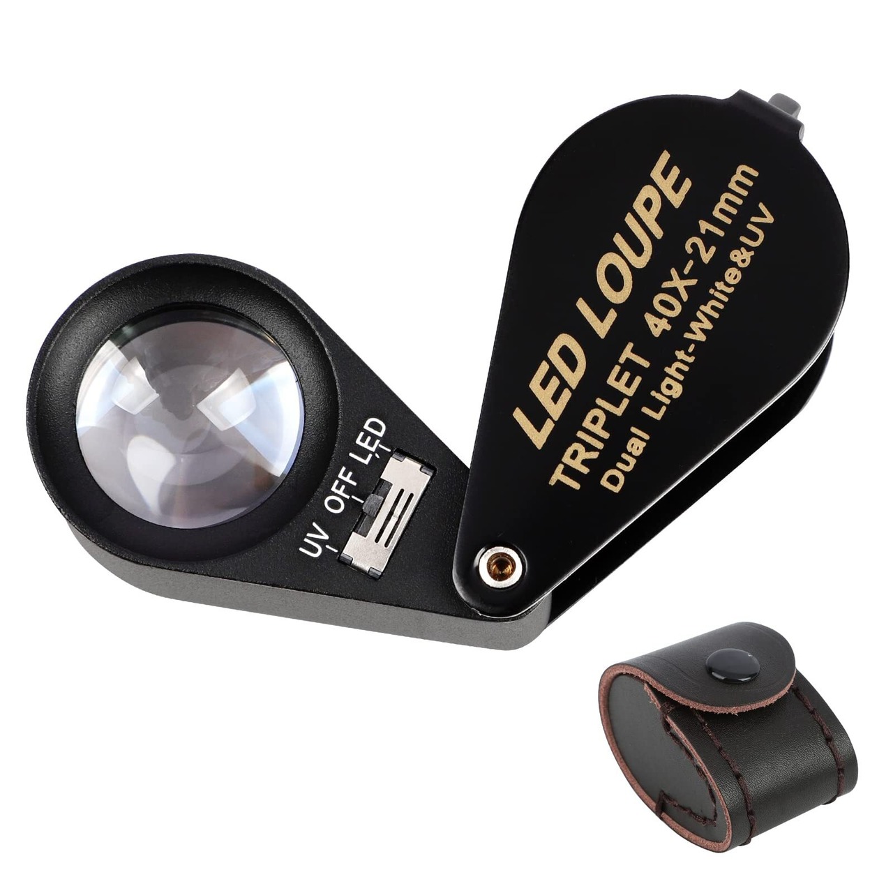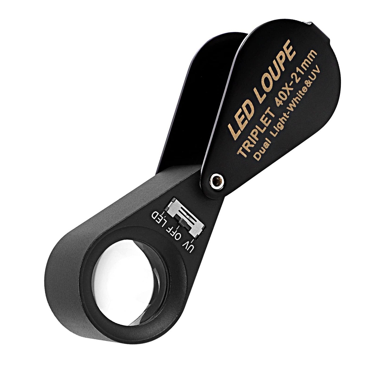 WOVTE拡大鏡 ルーペ40倍 携帯ルーペ ジュエリールーペ 宝石鑑定用 ダイヤモンドルーペ 虫眼鏡 高倍率40倍 拡大鏡 折りたたみ式LEDとUVライト付きルーペ