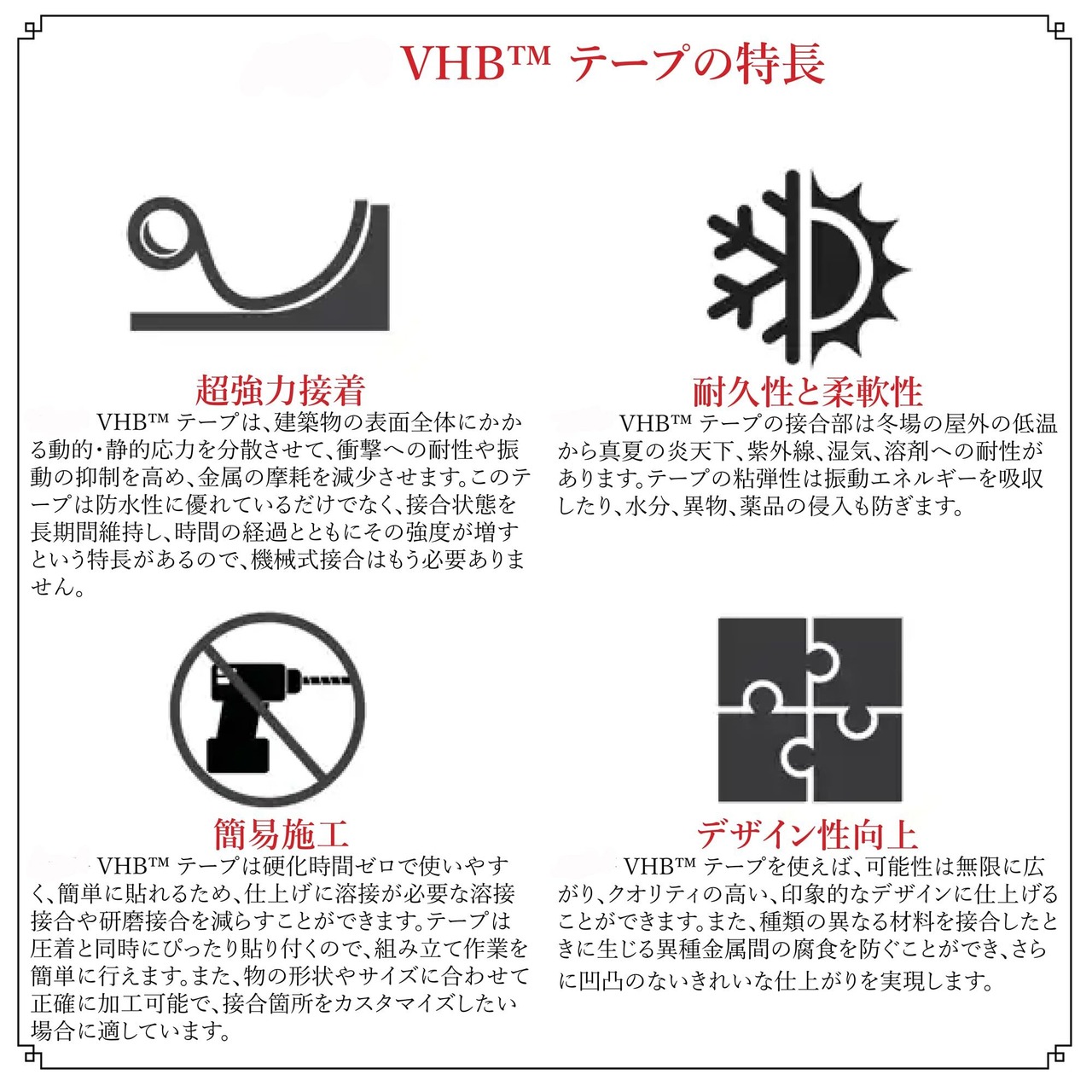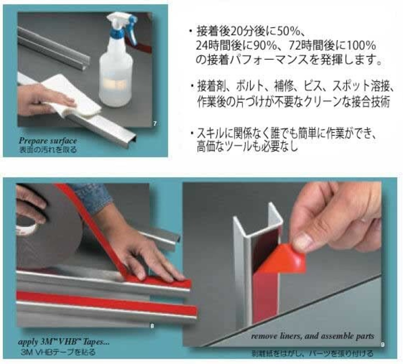 VHB構造用接合テープは接着剤、ビズ、ボルト、スポット溶接に代わる新世代の接合技術です。簡単な作業で強力な接合、しかも美しい仕上がりが実現します。当商品は業務用を一般向けに加工し特価にてご提供しております。