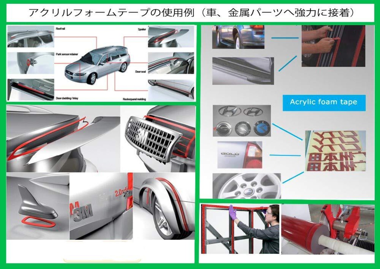 【商品特性】プラスチック・金属接着用。従来のアクリルフォームテープの優れた特性に加え、粘着剤を改良することにより、特にプラスチック全般に対しての接着性を向上させたものです。また、フォーム材は、形状追従性に優れたフォームを使用しているため、被着体に対する濡れ性も優れています。フォームが黒色のため、デザイン性が気になる箇所にも検討可能です。
