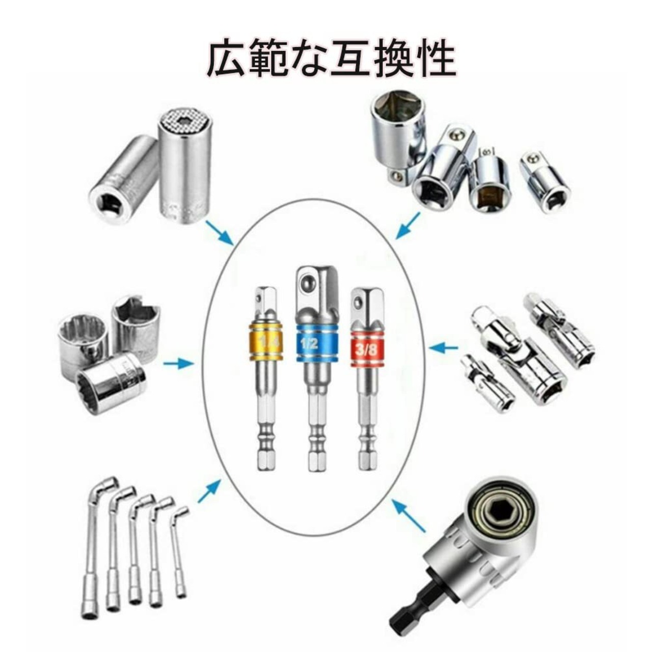 ソケットアダプターセット ソケットビット 電動ドリルソケット 六角ビット セット 差込角 1/4 (6.35mm) 3/8 (9.5mm) 1/2 (12.7mm) 六角ドリルビット