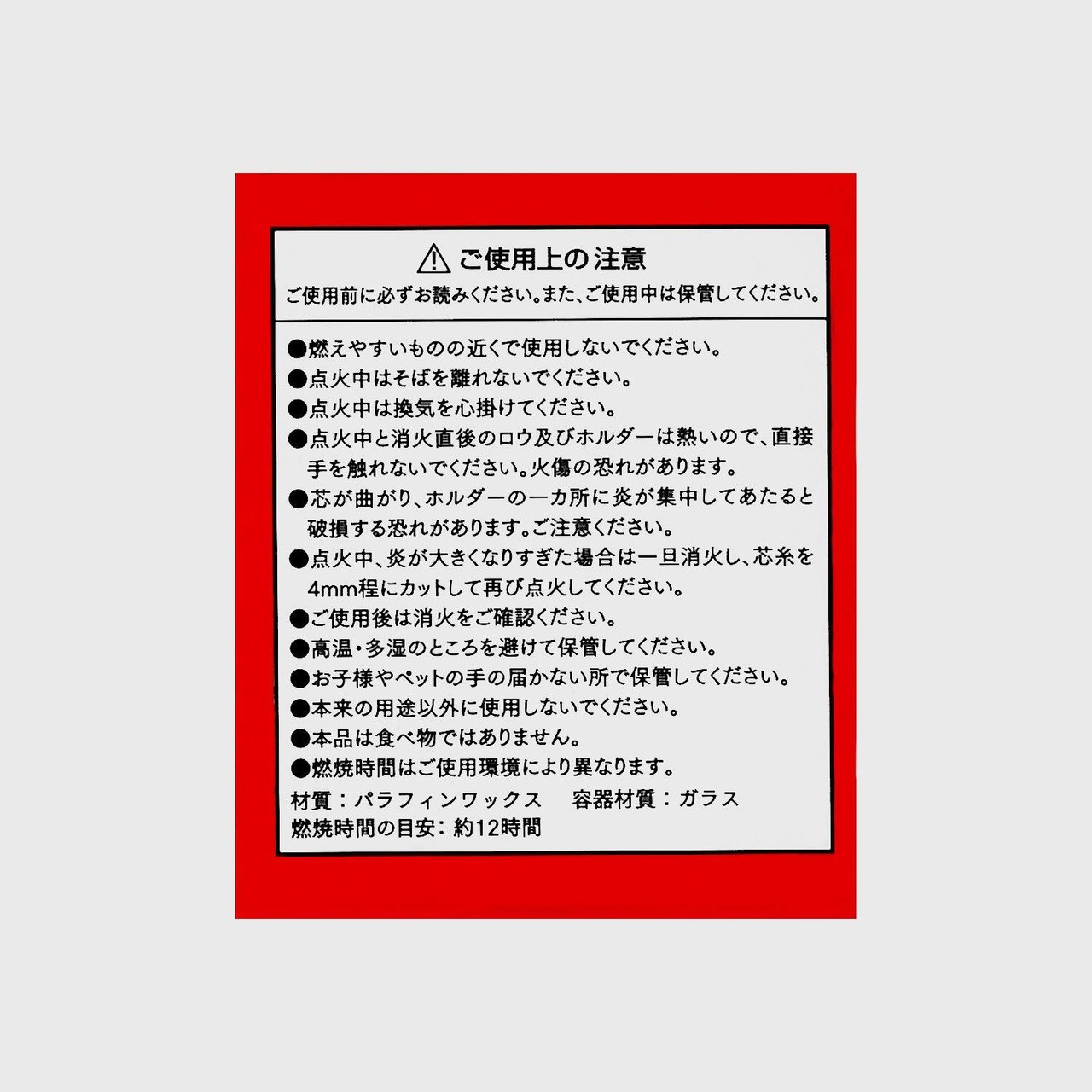 大香のローソクは、パラフィンワックスを使用しており、ススや煙が少ないクリーンな燃焼が特徴です。お部屋の環境に優しく、安心してご使用いただけます。