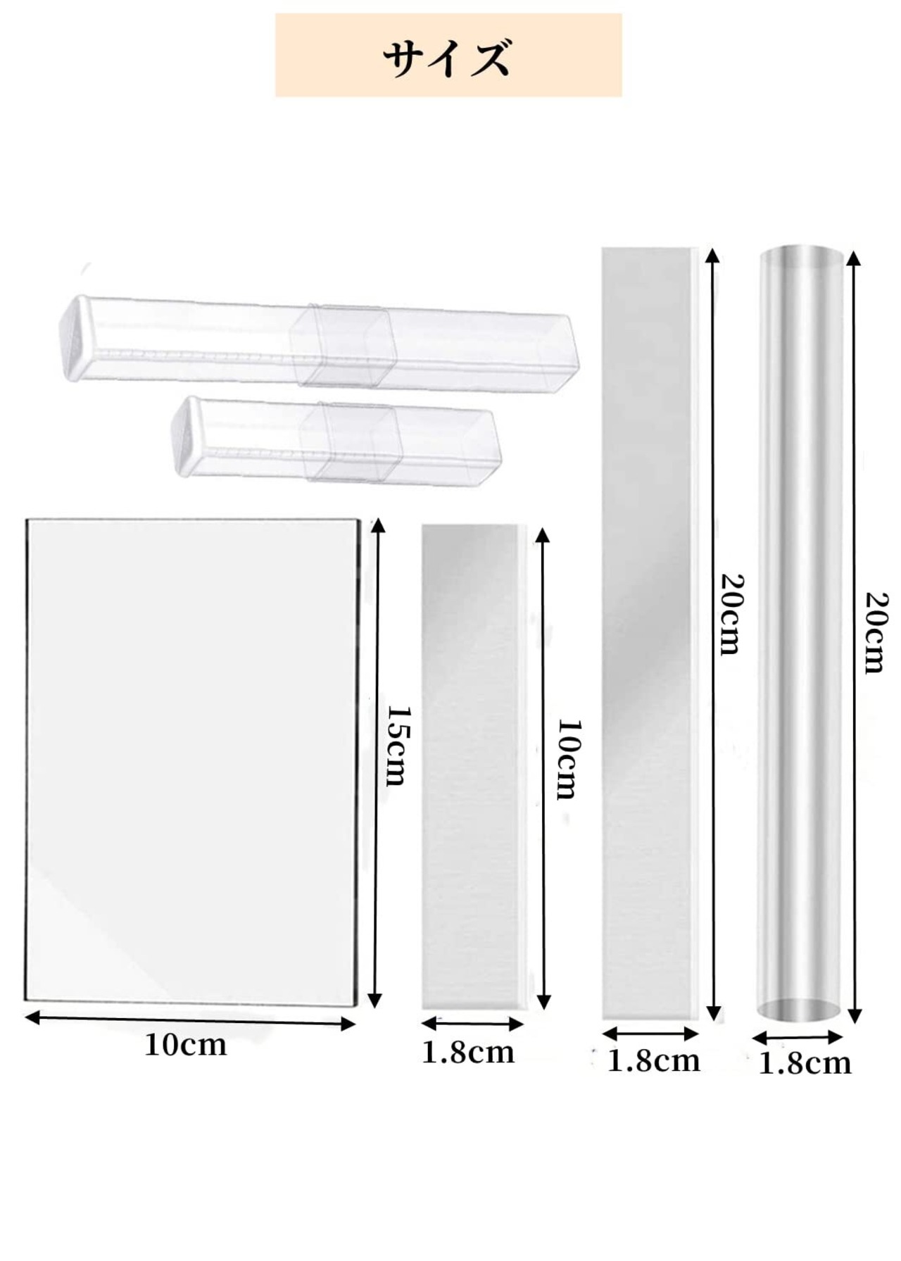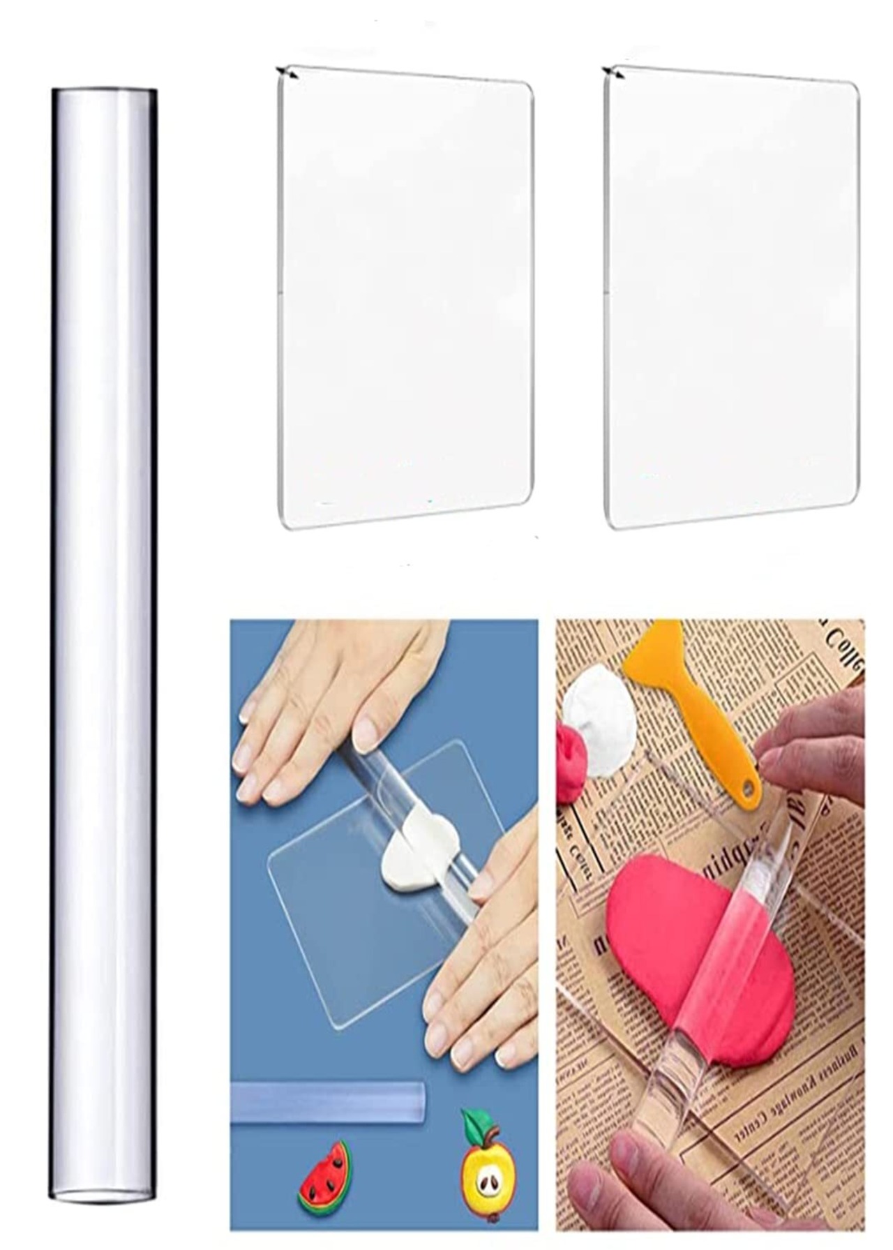 【商品仕様】サイズ:粘土ローラー:直径1.8cm*長さ20cm、アクリル板:15*10cm、カッター:1.8cm*10cm+ 1.8cm*20cm