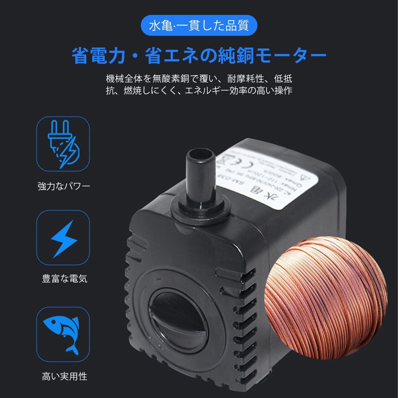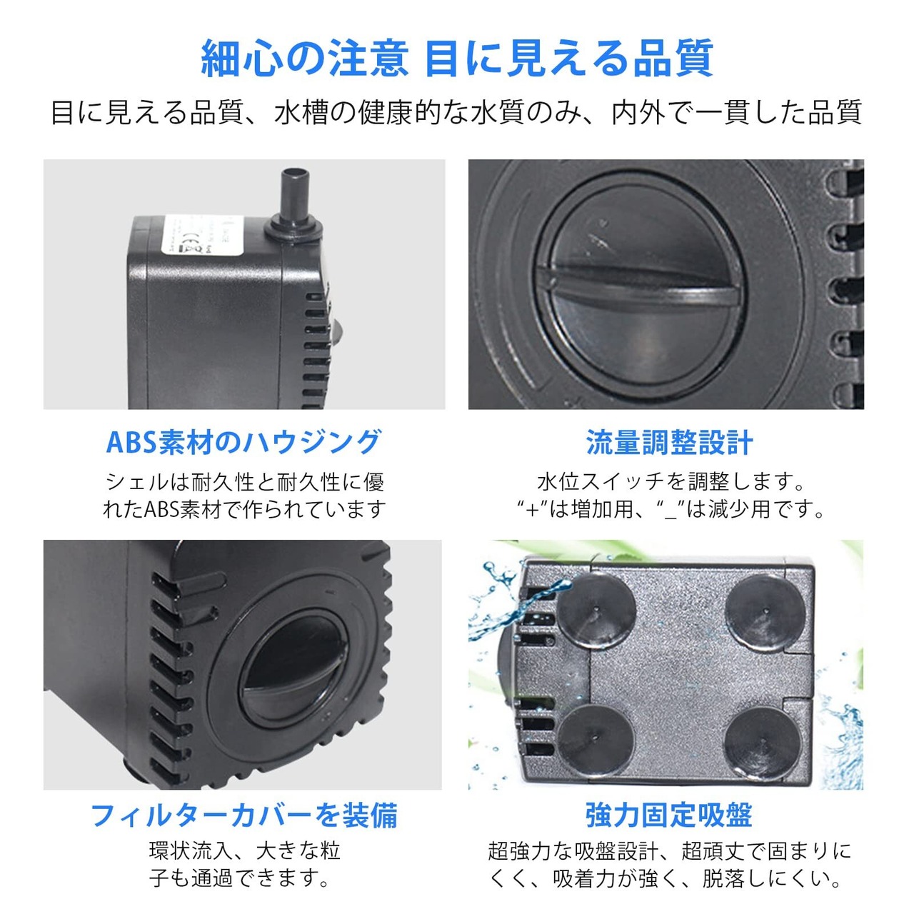 【超静音設計】高性能ステンレス鋼シャフトハートの使用、淡水・海水共通で水とポンプ壁の摩擦・共振を低減。従来品より約80%低減、超静音・超低振動・小型・軽量です。30~40デシベル、底部に吸盤を備え、安定性が高く騒音を低減。超強力な吸盤設計、超頑丈で固まりにくく、吸着力が強く、脱落しにくい。